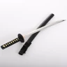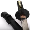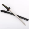 This replica respects the traditional look of samurai swords. The handle (tsuka) is lined with light faux ray skin, creating a striking contrast with the black cotton wrapping (tsuka-ito). The circular guard (tsuba) is made of metal with a black finish and decorated with relief motifs. A standout feature of this model is the scabbard (saya), which is made of aluminum with a black finish. This makes it extremely durable; unlike wood, it will not warp due to humidity, ensuring the sword always fits perfectly while looking identical to a traditional lacquered scabbard.
