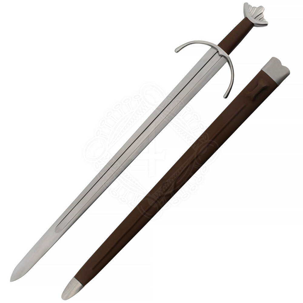 Hanwei's version of the sword replicates the lobated pommel and steeplydowncurved quillons of the hilt perfectly, while the wide-fullered blade is reproduced in 5160 high-carbon steel. The weight and balance provide for a very usable sword. No details of the original scabbard are known, but the styling of Hanwei’s leather-covered version is typical of the period.