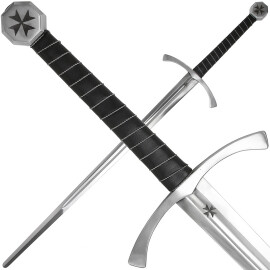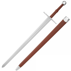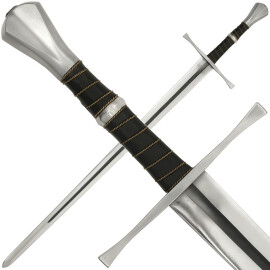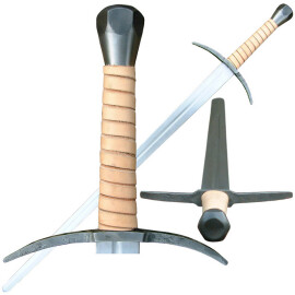2xThis sword is suited for beginners and light swordplay. The high-quality carbon steel blade is forged in one piece to the pommel and double-screwed for safety. The wooden hilt has a blue leather wrapping. The cross guard is made from hand-forged carbon steel. Further product information ...