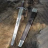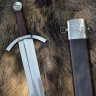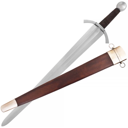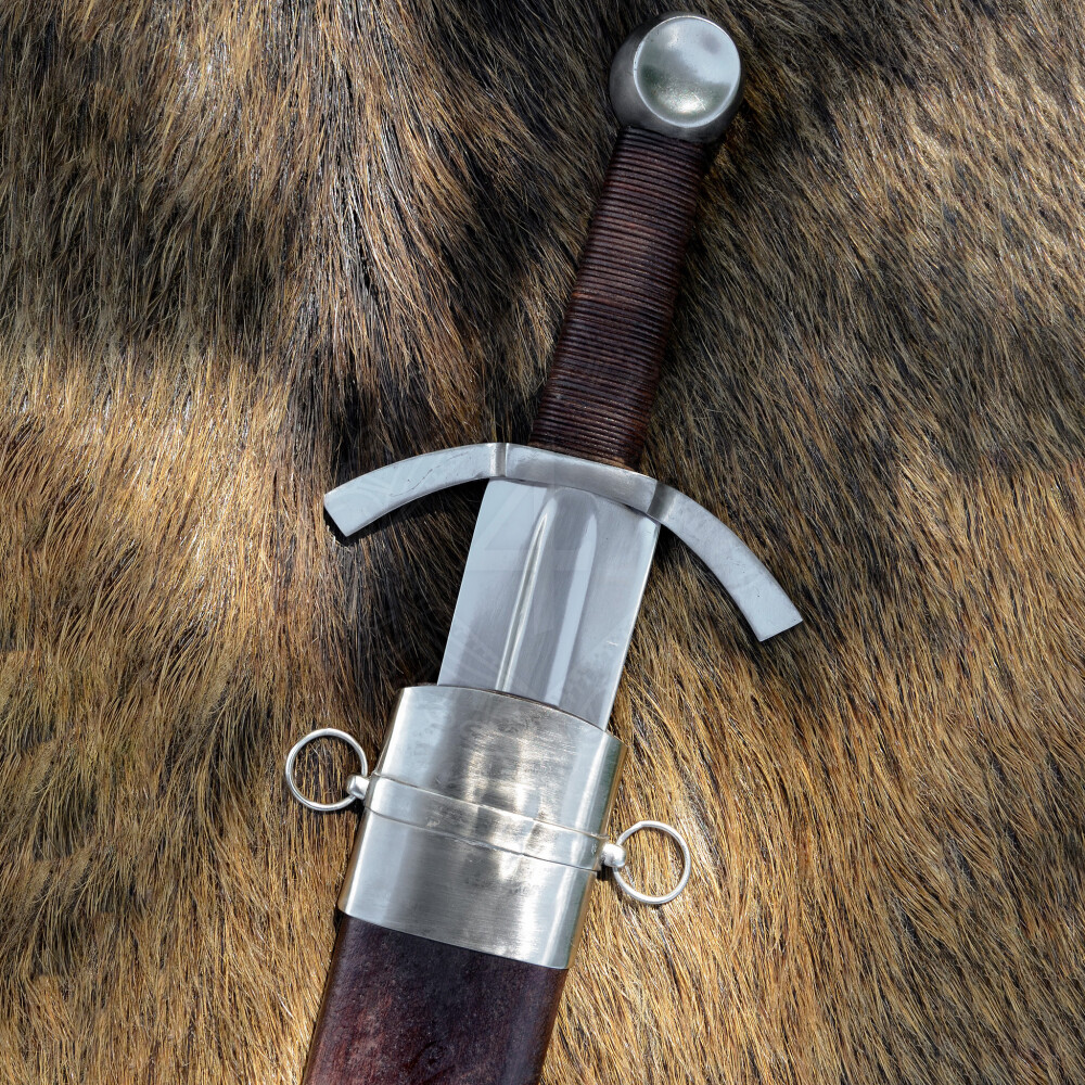 This one-handed medieval sword impresses with its beautiful leather-bound wooden handle with a round, slightly flattened and dented pommel, as well as the striking crossguard. Further product information ...
