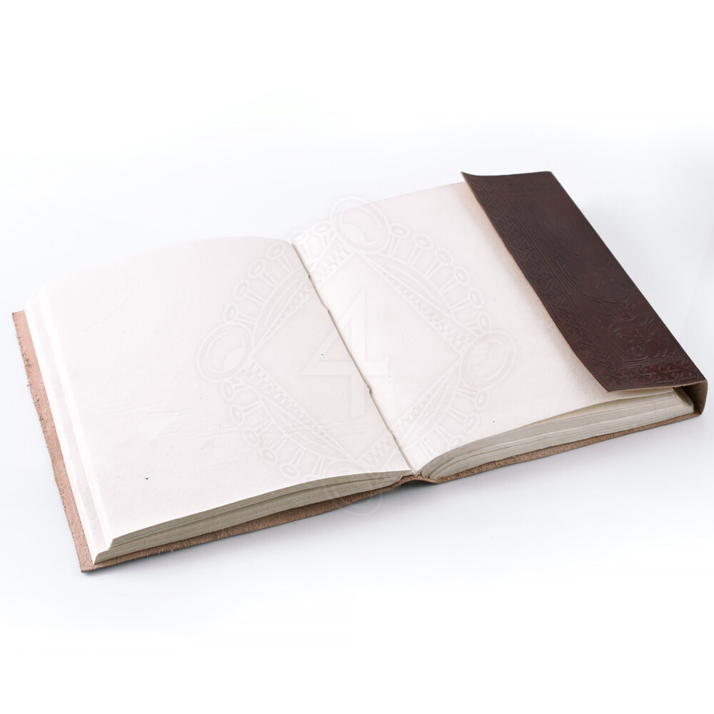 This leather journal features embossments of ancient, historical motifs. In present case, the design consists of a pentagram embossed on the front and on the back and framed with early medieval ornaments.