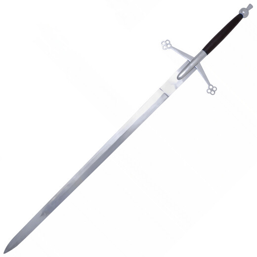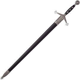 The claymore is a two-handed sword common in Scotland in the 16th and 17th centuries. There are various names and spellings for this sword, most of which come from the Gaelic: Claidhem-More, Claidhmhichean-mora, Glaymore, claidheamh mòr, which simply means great sword. It is a long two-handed sword with a double-edged blade and a broad, often V-shaped crossguard, with circular decorations attached to the ends. The earlier claymore swords often had a long leather-wrapped ricasso. Further product information ...