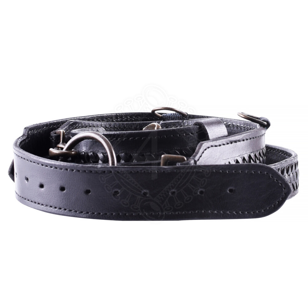 A double-breasted sword belt made of high-quality coloured cowhide with lavish lacing on the belt strap.. The upper thin belt is about 3cm wide and is strapped around the waist.The approx. 5cm wide belt is a little longer and hangs comfortably a bit lower. On this one two D-rings and a ring held by two carabiners are attached, so a sword sheath or something similar can be attached. Further product information ...