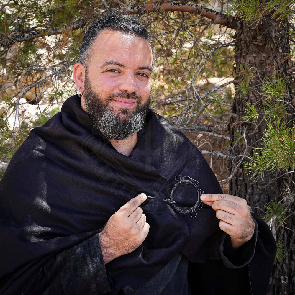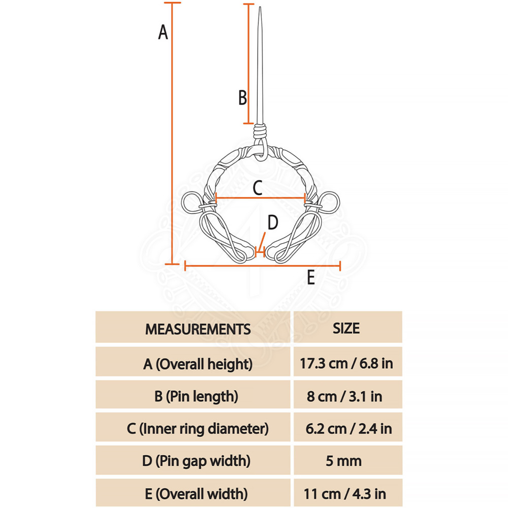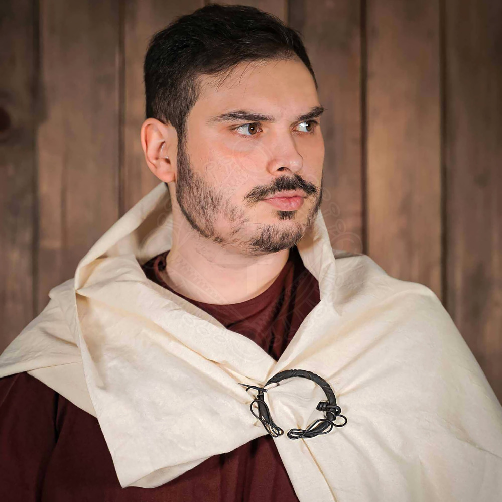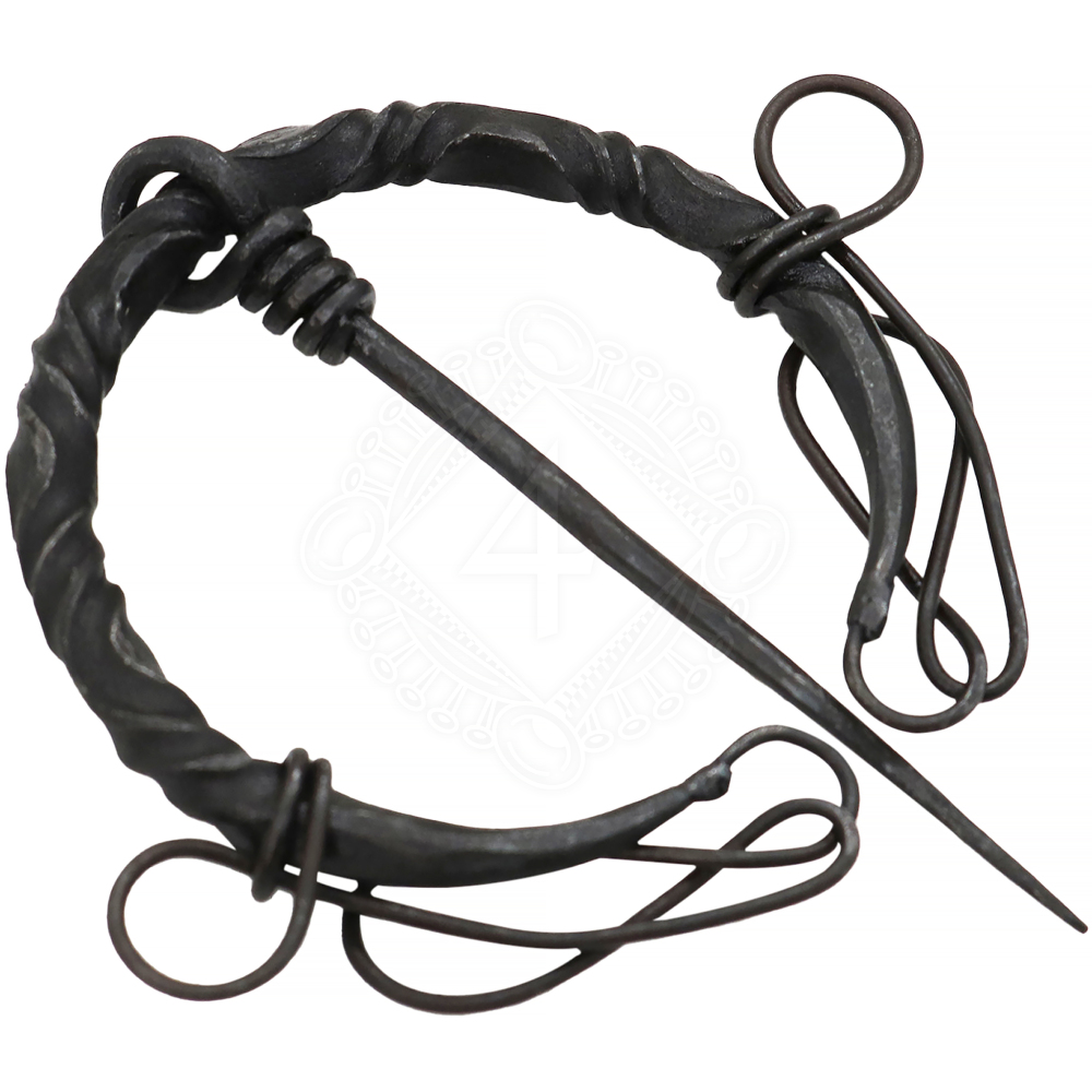 Complete your historical garment with a truly authentic and functional piece! This hand-forged penannular brooch, also known as a fibula, is an indispensable accessory for any enthusiast of the Viking era, Celtic culture, re-enactment, or LARP. Its robust design, inspired by 9th-century archaeological finds, is not just for show – it is designed to securely fasten even a heavy woollen cloak, plaid, or tunic. The body of the brooch is crafted from a single piece of iron, impressively twisted around its circumference, and finished with intricately looped terminals. The long, sharp pin ensures a firm hold in the fabric. This piece of forged jewellery will give your costume a stamp of originality and period accuracy. Further product information ...