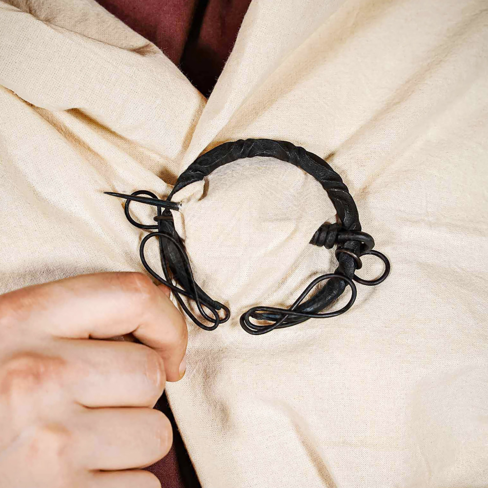 Each brooch is the result of honest craftsmanship, making it a unique original. The surface bears the marks of the forge and has a dark, rustic patina that enhances its historical feel. The twisted design of the ring is not merely decorative; it also adds strength to the brooch. The ornate looped ends, known as terminals, are a characteristic feature of Norse and Celtic craftsmanship and attest to the skill of ancient smiths. This Viking brooch is massive and sturdy, perfect for fastening coarse fabrics without risk of damage.