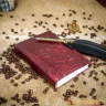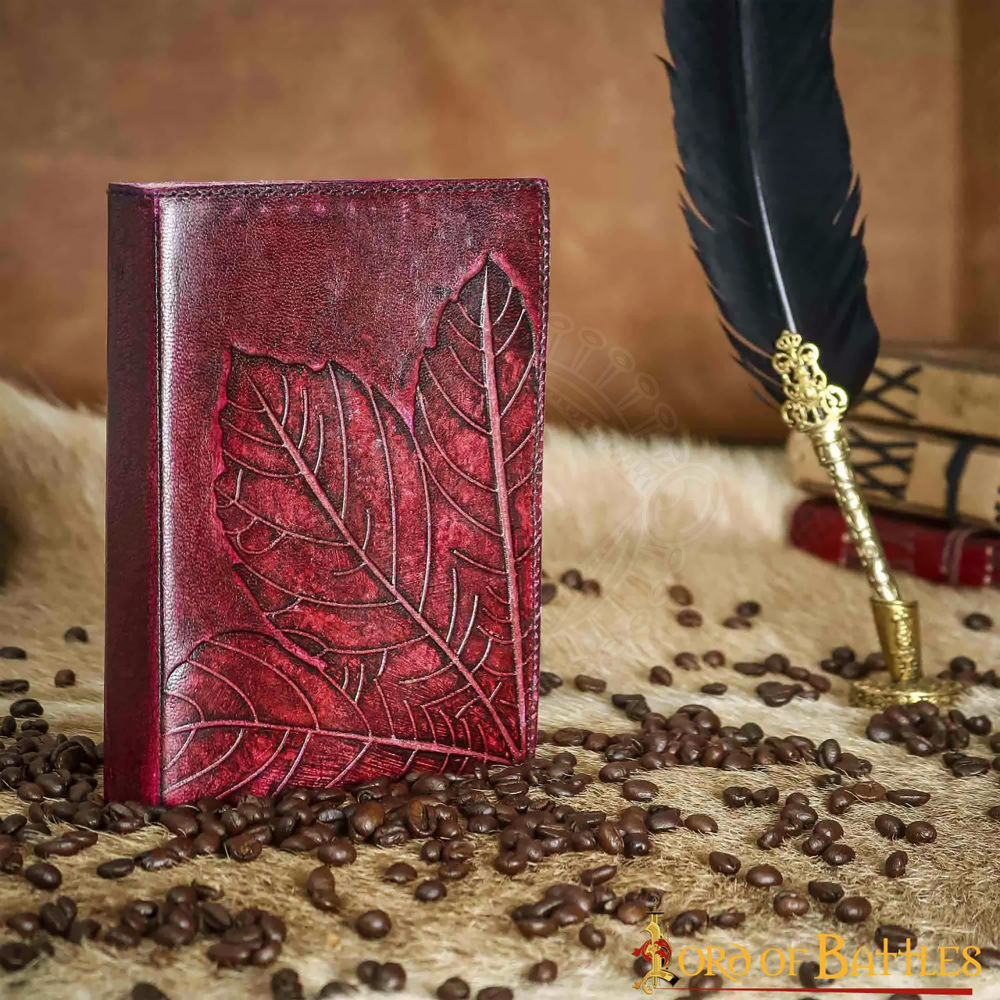 - Cover: The cover is crafted from genuine buffalo leather, dyed a rich red, almost burgundy, shade. The deep embossing of the leaf with its detailed texture is the main feature of the design.