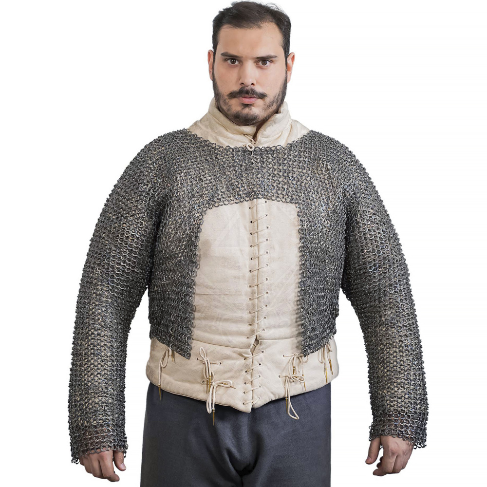 Please note: The gambeson (padded jacket) and other accessories shown in the photo are not included with these chainmail sleeves and are for illustrative purposes of their potential use and attachment only.
