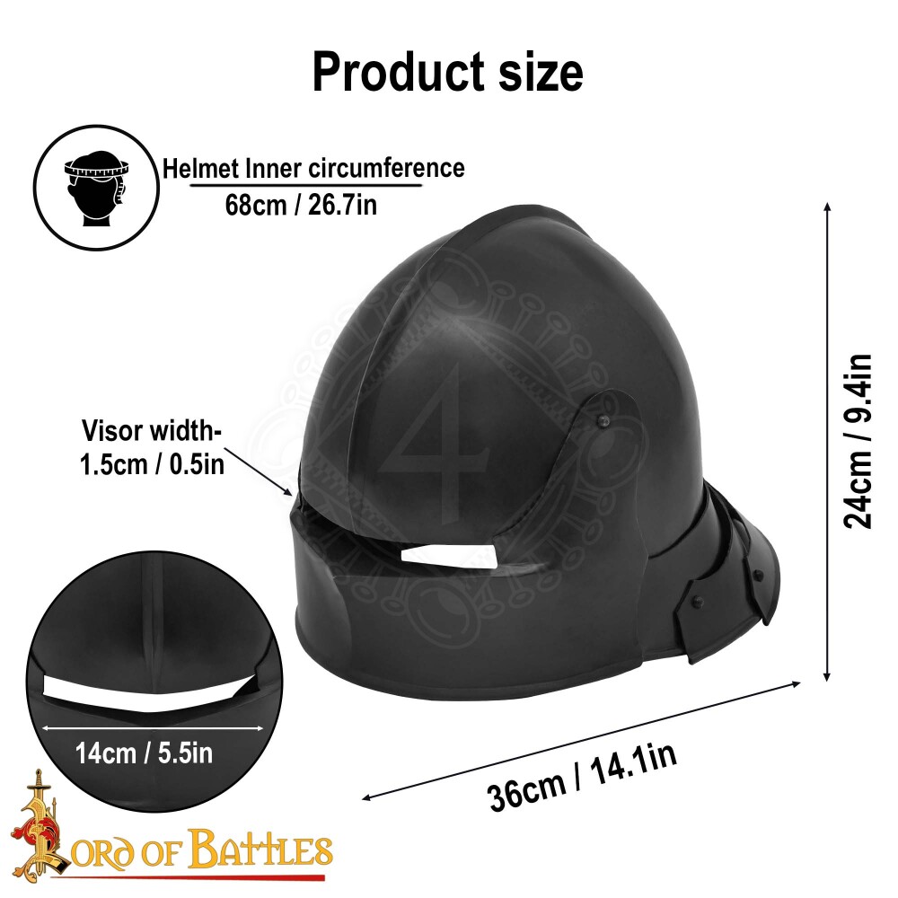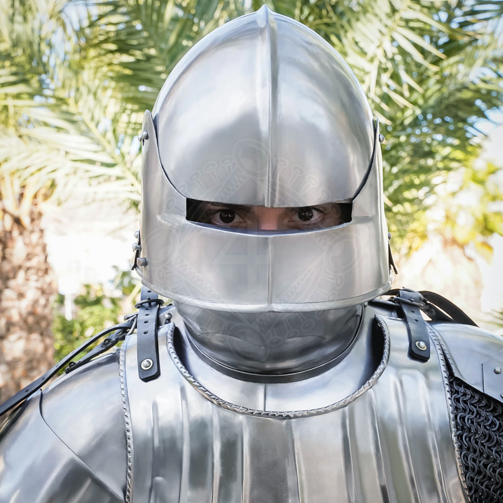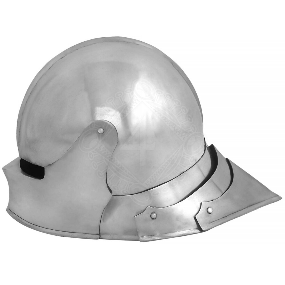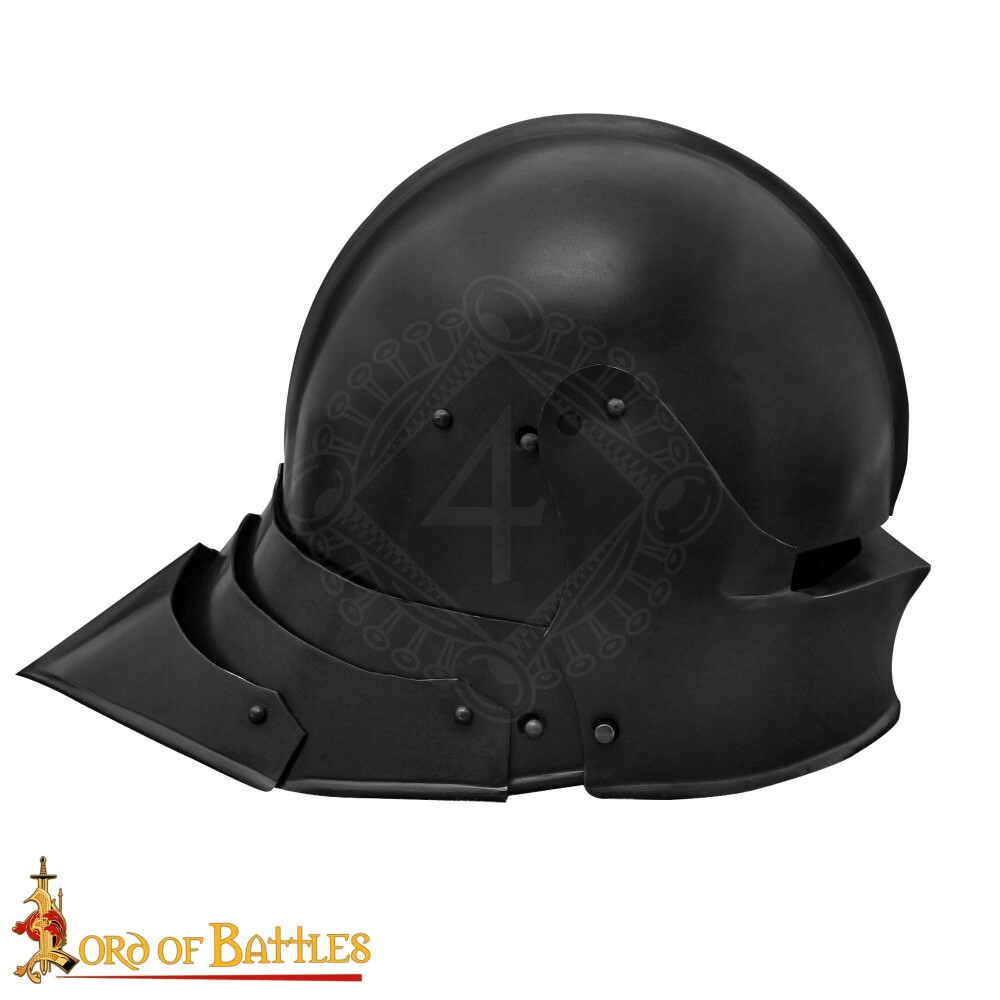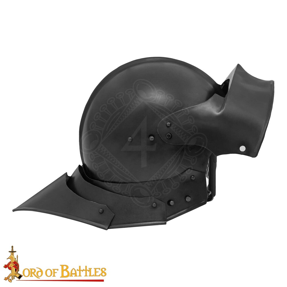 The helmet is crafted from **mild steel** (16-gauge / approx. 1.6 mm), providing sufficient durability for standard stage combat and reenactment. A typical feature of the sallet is the extended tail at the back, which protects the neck from attacks from behind while offering better mobility than older helmet types. This model is available in two distinct finishes, so you can choose the one that best suits your character: * **Polished:** Classic silver shine, ideal for a knight or nobleman's armor. * **Blackened:** A dark, matte finish that gives the armor a more menacing look or evokes a rougher, mercenary style ("black sallet"). The **pivoting visor** can be locked in the raised position using a locking pin, which you will appreciate when resting or issuing commands. In the lowered position, the narrow eye-slit (approx. 1 cm / 3/8 in) protects your eyes while maintaining a good view of the battlefield. For maximum safety, the visor is secured with a pin to prevent it from opening accidentally during movement.