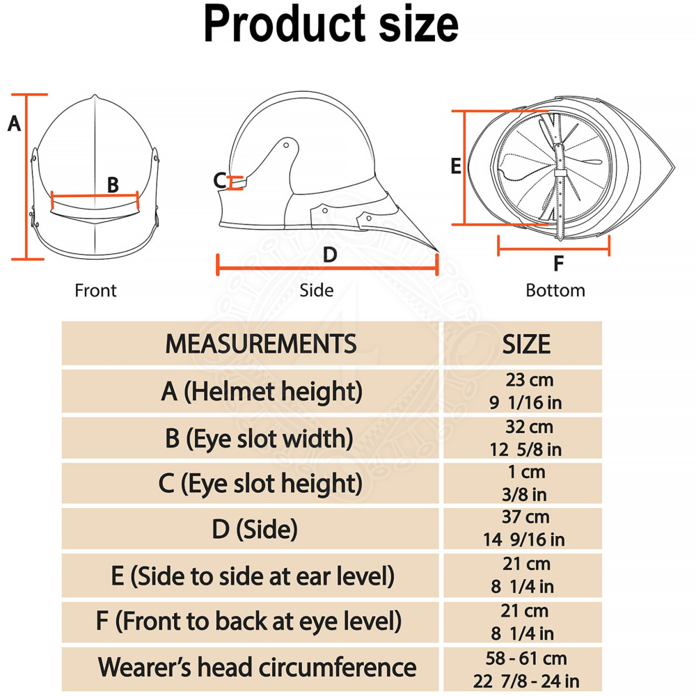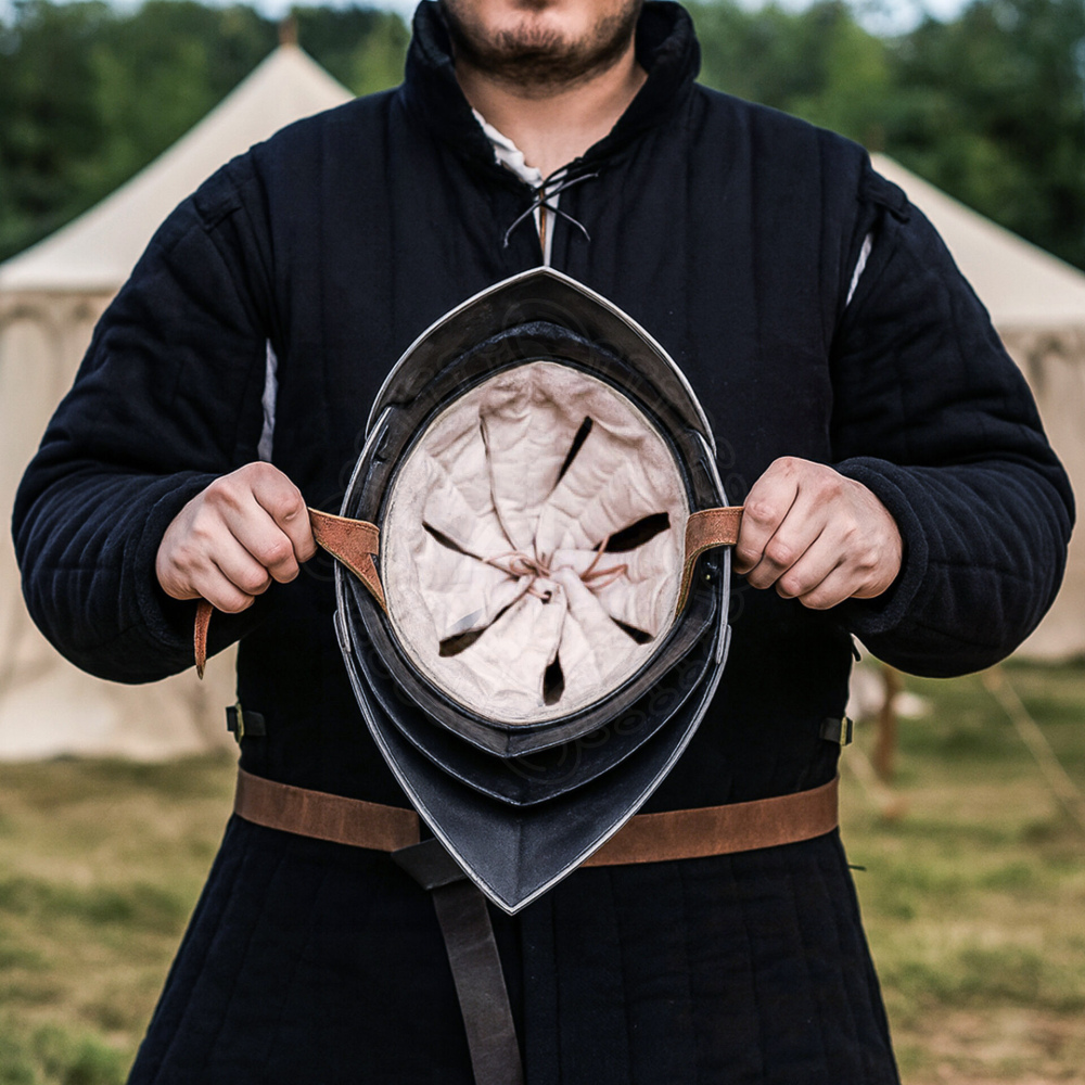 Due to the material (carbon steel), the helmet must be protected from moisture. Wipe it dry after every use and apply oil (e.g., WD-40 or gun oil) to prevent rust. Treat leather parts with leather balm. Warning: Although the helmet is functional, it is a replica made of 16-gauge steel. It is not designed for full-contact battles like Buhurt/Battle of the Nations, where thicker materials and special certifications are required. For standard historical fencing, we recommend wearing a padded arming cap underneath for increased shock absorption.