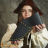 Set sail for adventure, embark on a boarding party, or simply stride through the tavern with confidence. Whether you are portraying a pirate, a musketeer, or a highwayman from the 18th century, your sidearm needs to be secure and ready. This handcrafted leather frog is the ultimate accessory for carrying your flintlock pistol replica. Crafted from genuine buff leather, known for its exceptional durability and rugged appeal, it is built to withstand the rigours of cosplay and LARP. The edge is adorned with antique brass rivets, adding a touch of timeless charm. Available in left and right-hand versions and in classic black or brown, it seamlessly integrates into your historical costume. Further product information ...