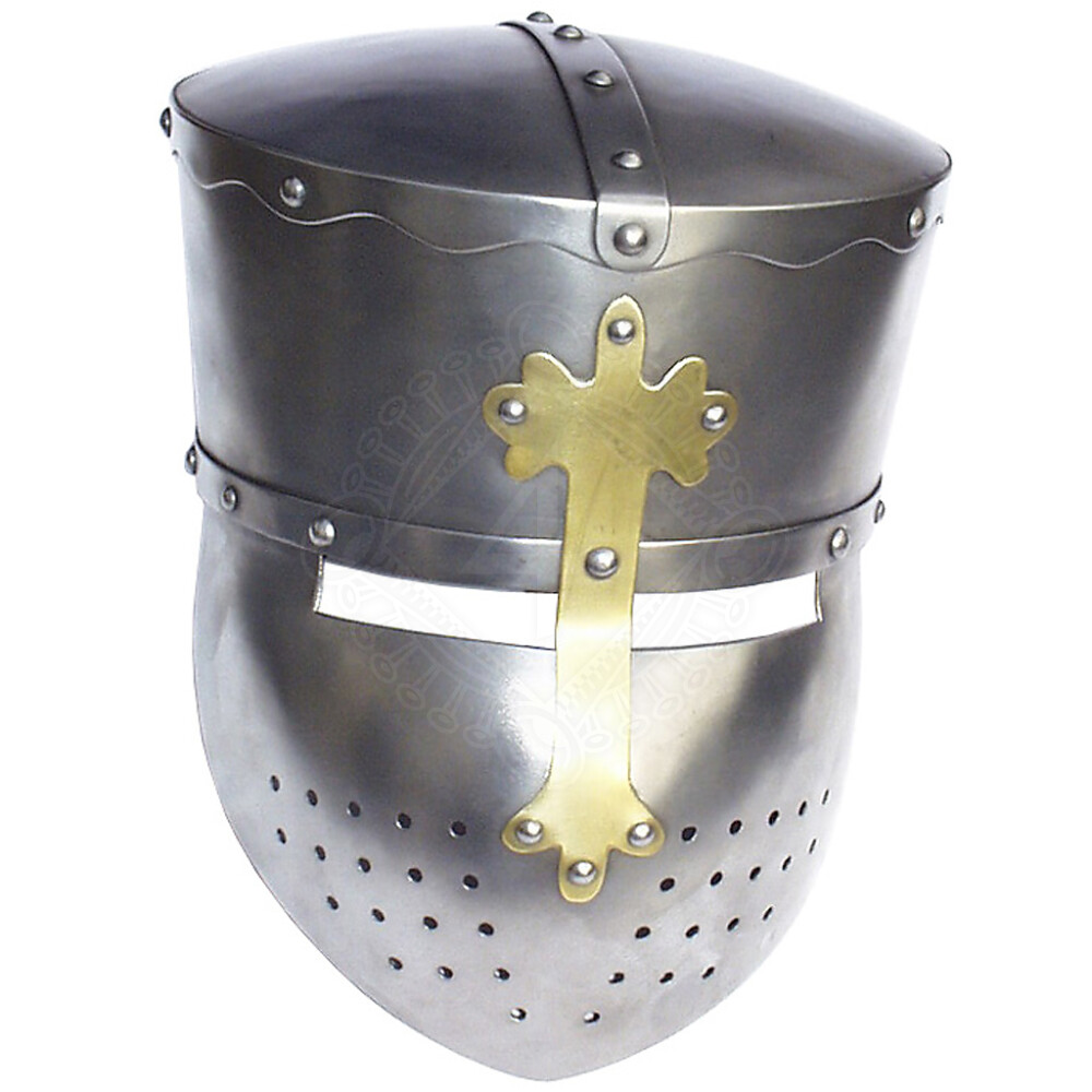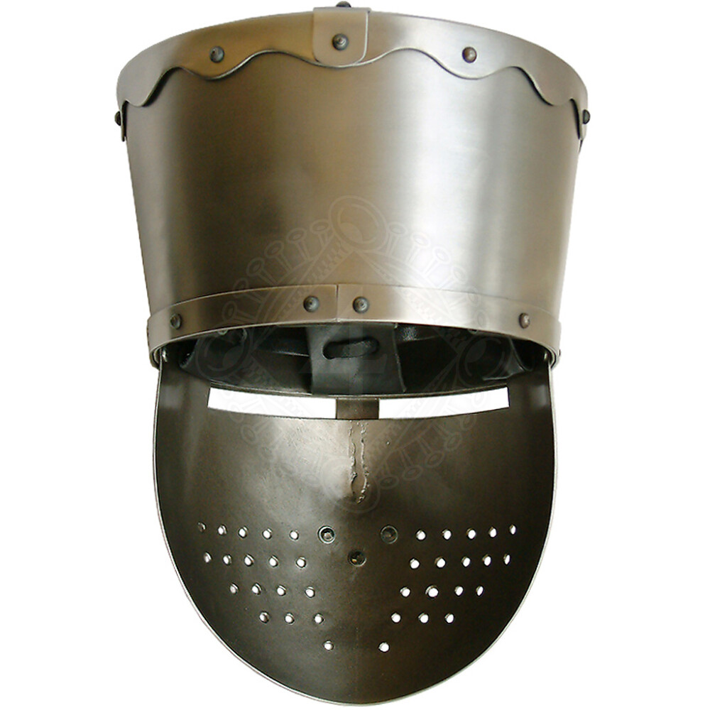The Barbiere, is a transitional helmet between the nasal and great helm. It was often decorated with metal strips, so that a cross was formed around on the front part and on the face shield. The Barbiere offers riders a good protection of the face. However, it limits the outlook of the knight. However, this is not tragic, as the horse takes over the running and the rider must only look forward. Further product information ...