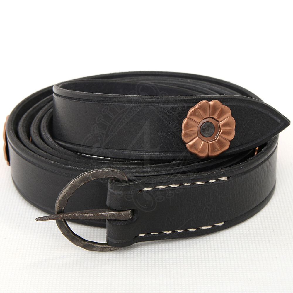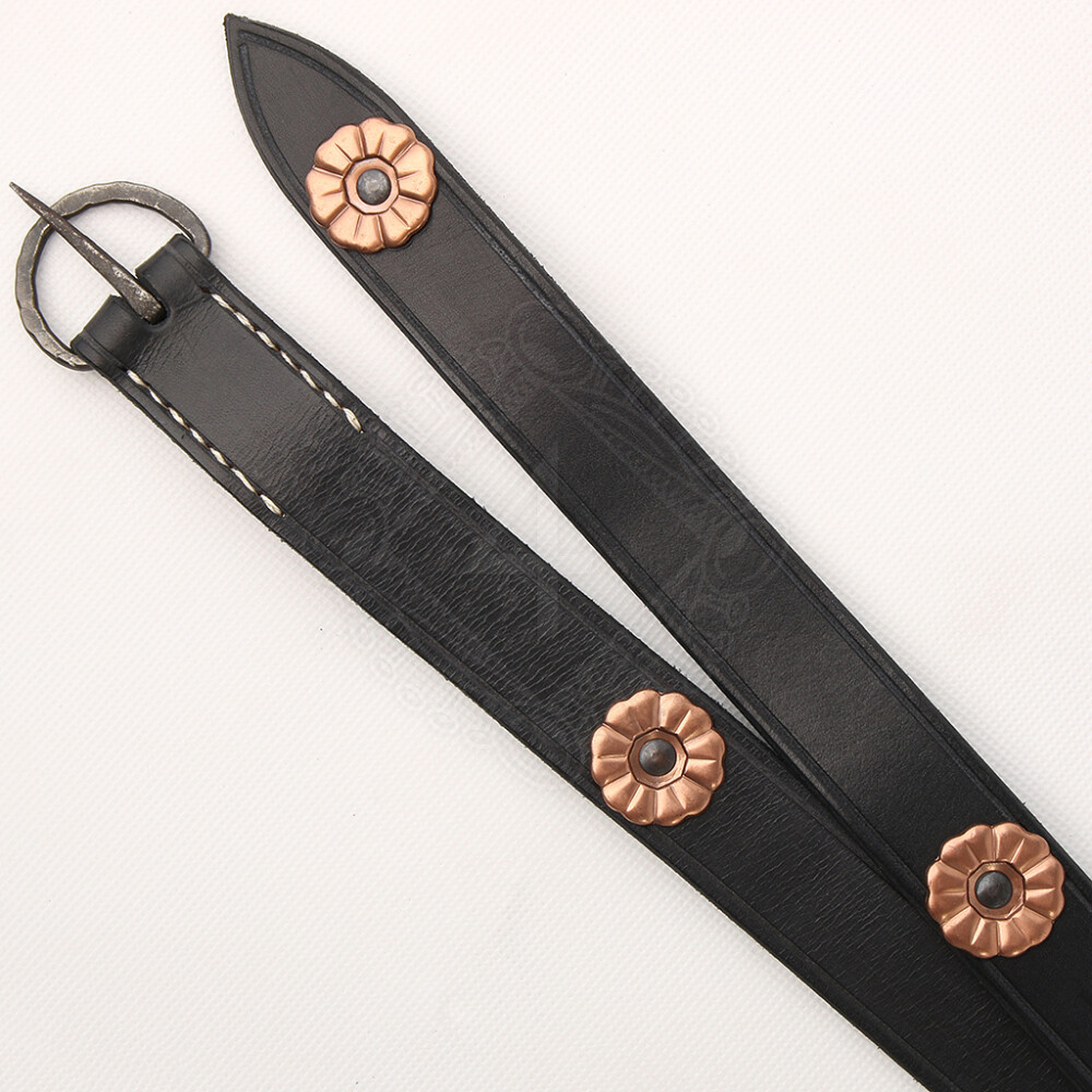 This Studded Belt was modelled on a specimen dating back to the 13th century. It is made of up to 4mm thick cowhide. Along its entire length it is decorated with flowers that are made of sheet metal in old copper colour. The edges of the belt are also decorated with an engraved groove. The buckle is forged of iron and provided with simple decoration. It is manually sewn onto the belt's strap with flaxy bleached thread. Further product information ...