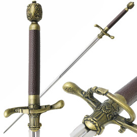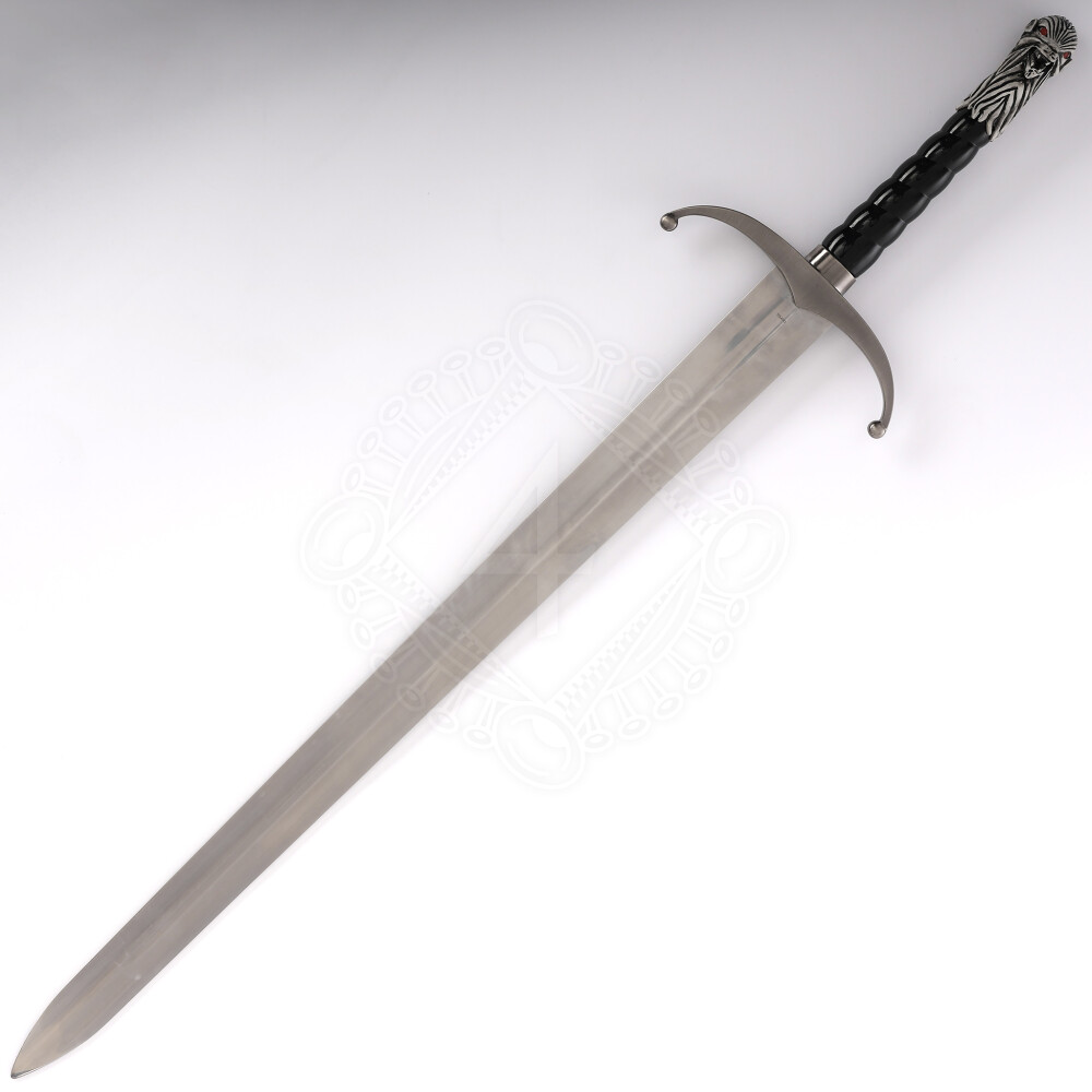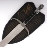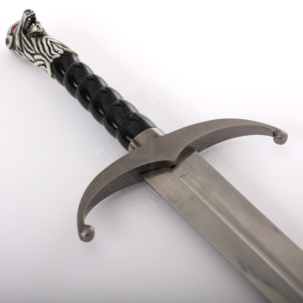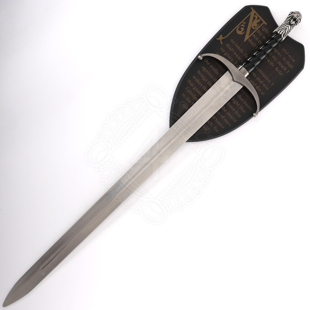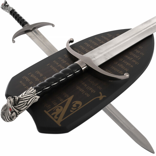 Die Klinge ist aus rostfreiem Stahl (wahrscheinlich 440), der Griff ist aus Kunststoff und der wolfsförmige Knauf ist aus Polyresin gefertigt. Die Wandplakette ist aus Spanplatte gefertigt. Das Schwert ist nur in der abgebildeten Version erhältlich. Eine Gravur mit dem Namen und andere kundenspezifische Änderungen sind leider nicht möglich. Further product information ...