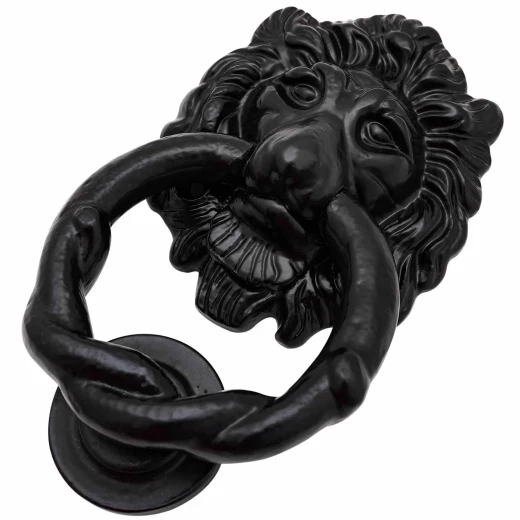 The knocker is crafted from honest cast iron, which gives it a substantial weight and guarantees exceptional resistance to the elements. The detailed casting of the lion's mane and its determined expression are a testament to quality craftsmanship. The striker ring, held in the lion's mouth, features a rustic design resembling a twisted rope. The entire set, including the separate striker plate, is treated with a durable black baked-on finish that protects it from rust and maintains its classic appearance for many years.
