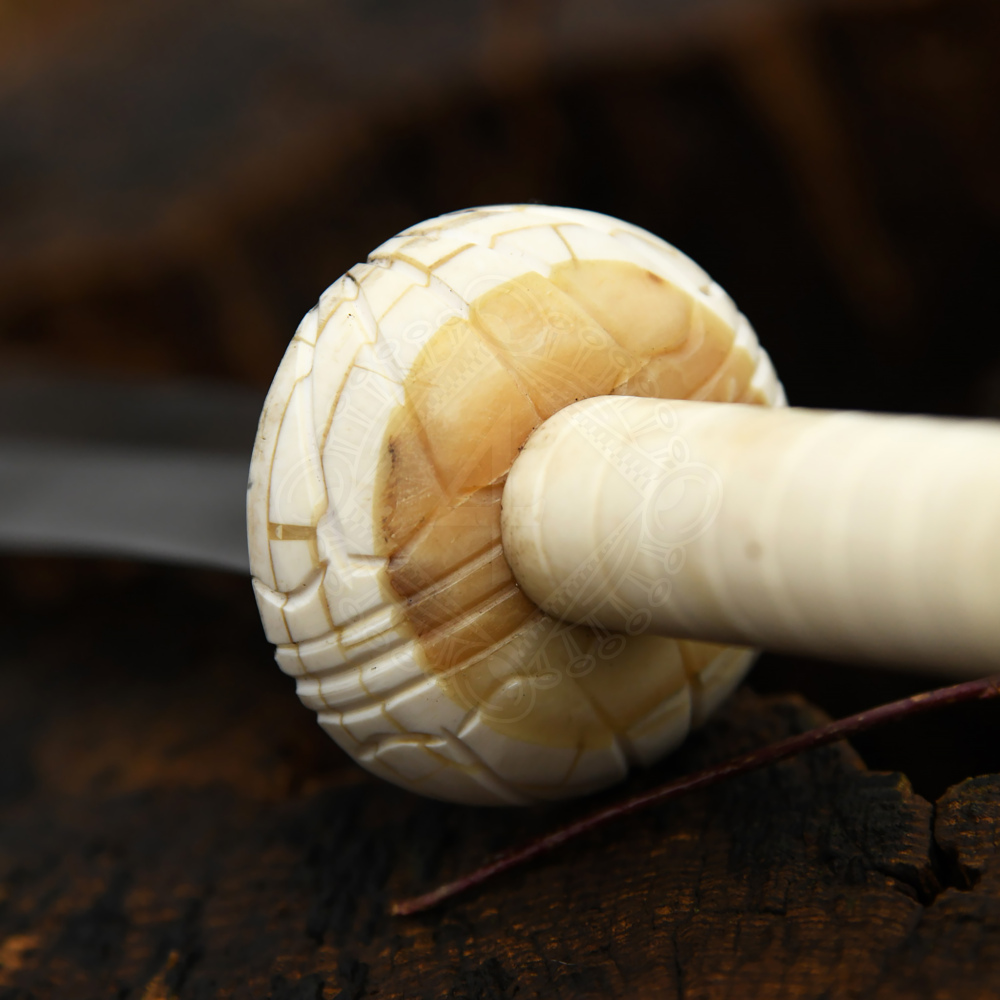 The highly detailed handle is crafted from naturally grown animal bone. Please be aware that because this is a natural material, small hairline cracks or slight colour variations are entirely normal. Such minor imperfections look authentic, natural, and unique, and they do not reduce the quality or the structural integrity of the handle in any way. To prevent further cracking, keep the bone away from extreme heat and humidity changes. The forged carbon steel blade is susceptible to rust, so you must regularly coat it with a light layer of gun oil after every use or handling.