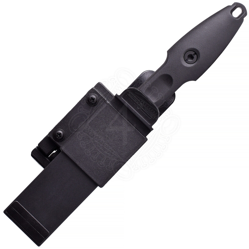 The back of the blade is designed so to allow user to rest their thumb or palm against it, according to wielding style. The handle is made from sturdy and nonslip nylon. The included hard sheath can be worn vertically, horizontally or obliquely (at a 45° angle).