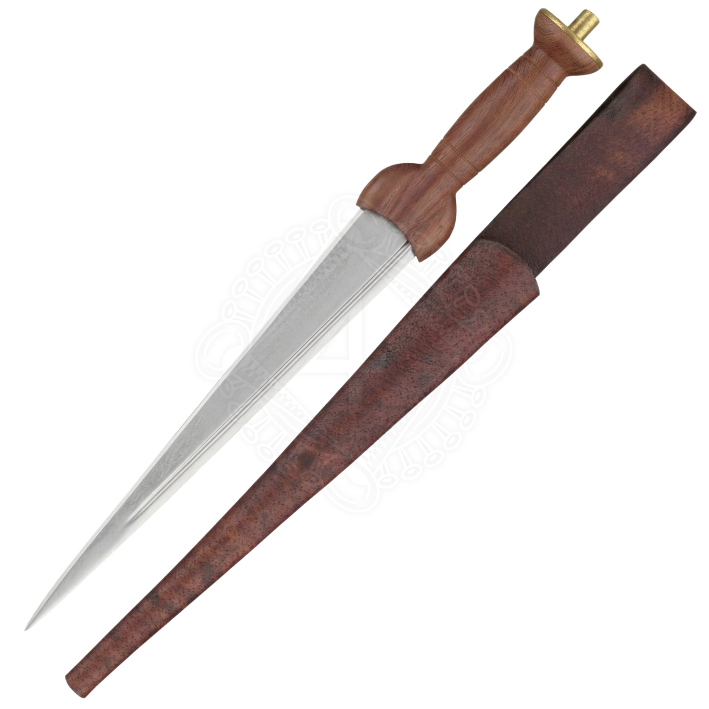 The weapon boasts a massive, wedge-shaped blade. Adjacent to the blade is a hand-carved solid wood grip, which is crowned by an elegant and robust pommel made of solid brass. We supply the dagger inclusive of a precisely fitting, simple sheath made of genuine leather, which reliably protects the weapon.