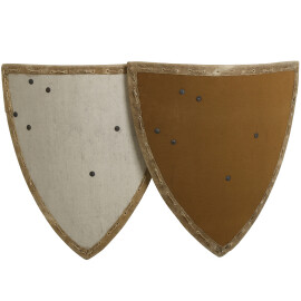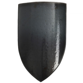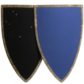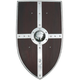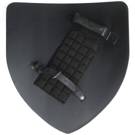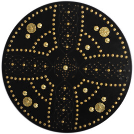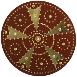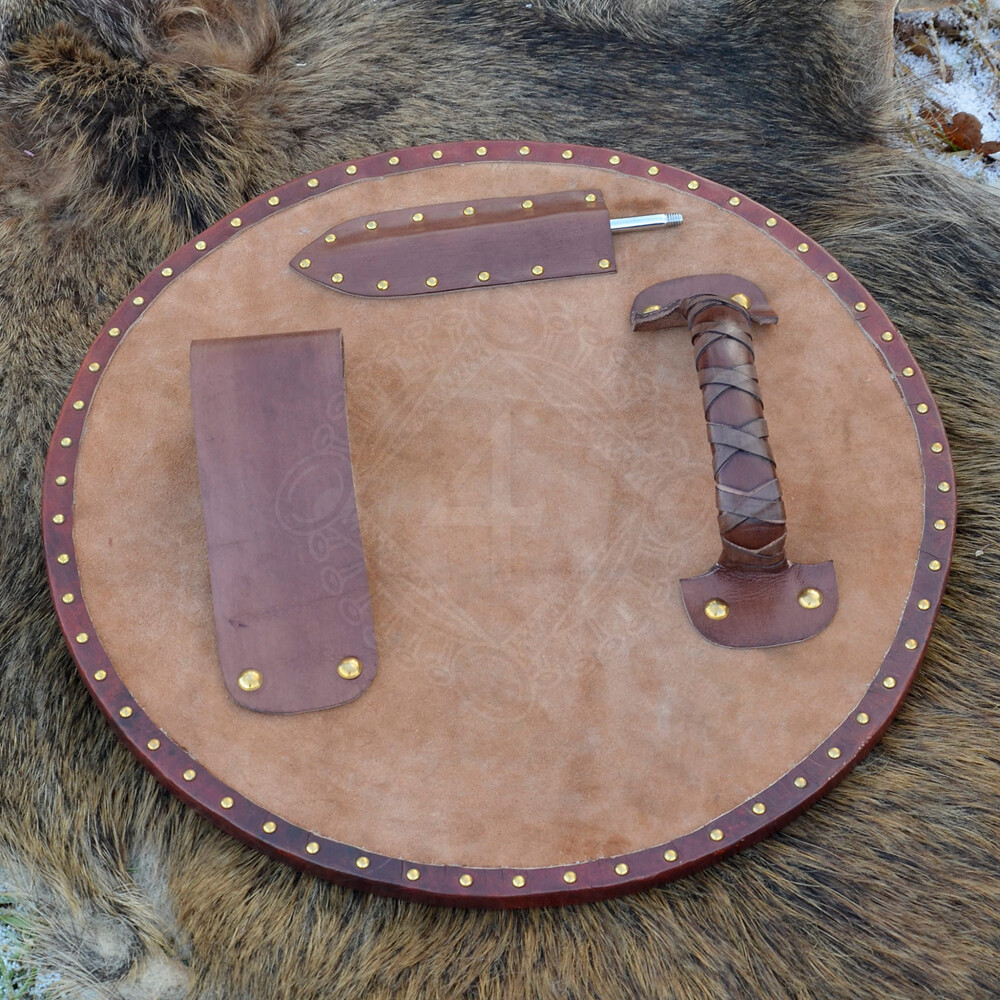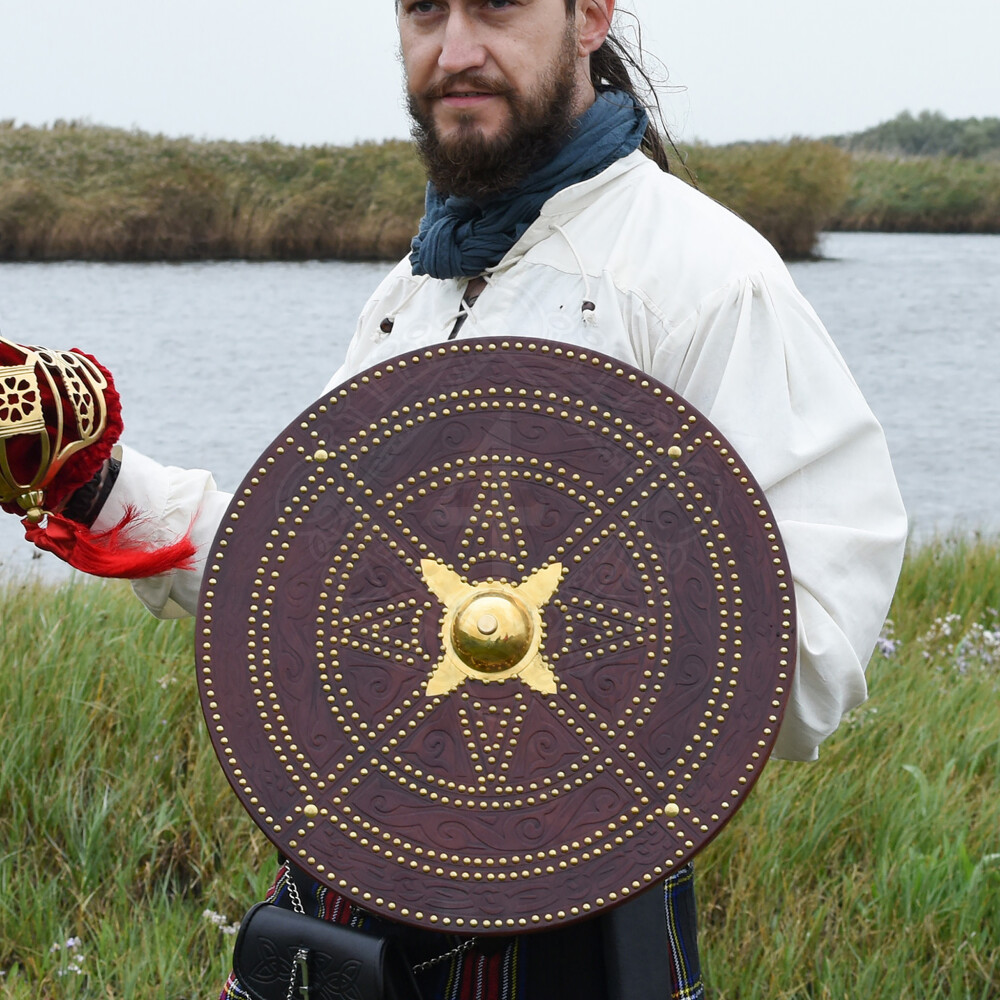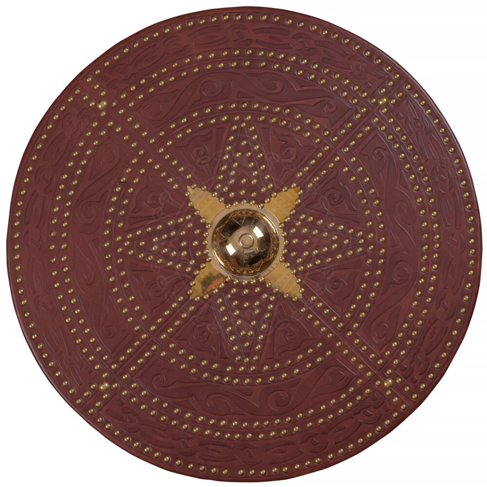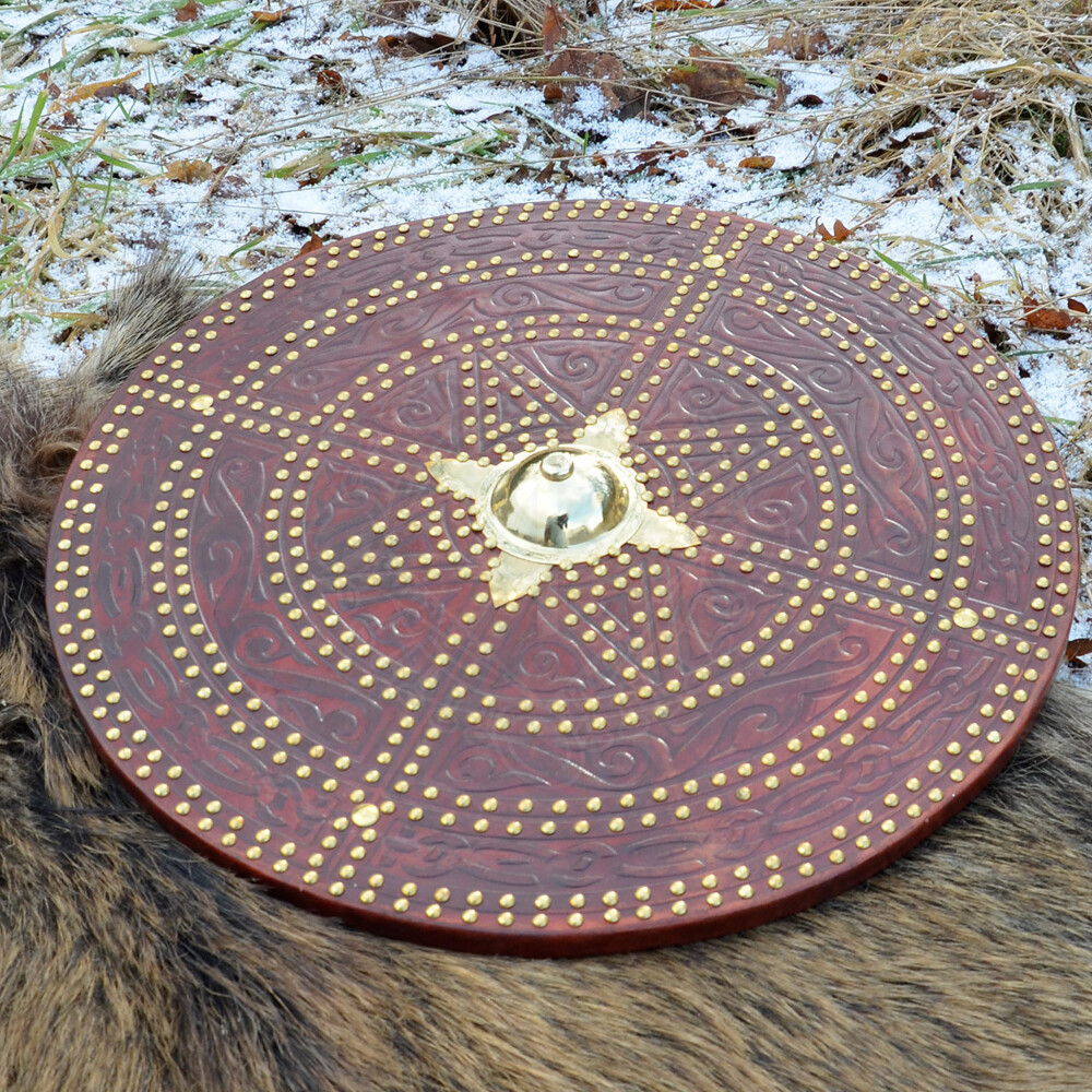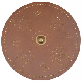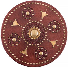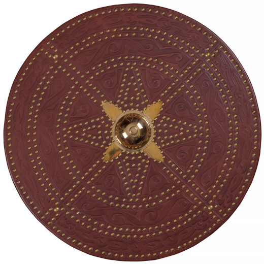 It features a brass shield boss in the center, decorative brass rivets and beautiful celtic ornaments embossed in the leather. The targe is manufactured with hand-dyed natural leather which is fixed by brass rivets.