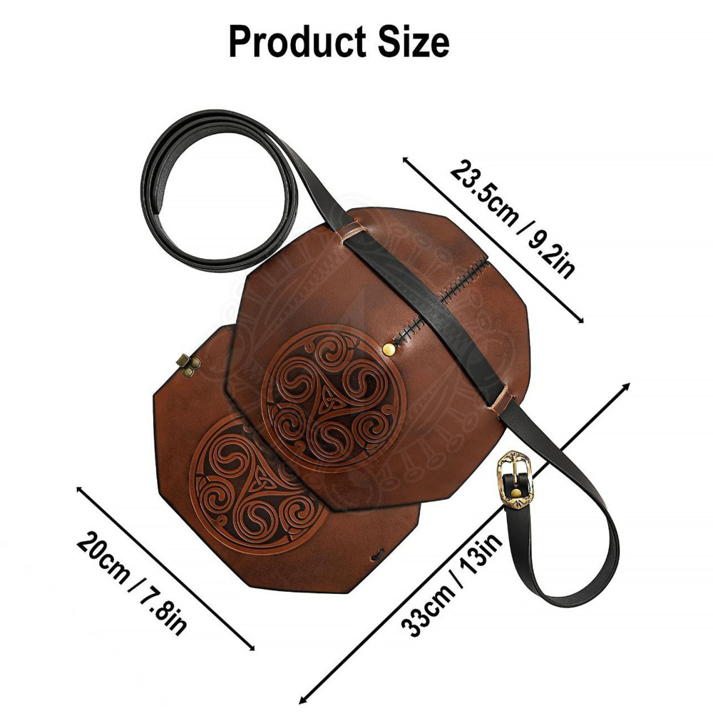 The Leather Pauldron is crafted from high-quality leather and adorned with detailed embossed Celtic motifs, specifically intertwined spirals reminiscent of a triskelion. This design not only looks superb but also references the rich history and mythology of Norse and Celtic warriors. The pauldron (shoulder guard) consists of two articulated leather plates, ensuring both flexibility and adequate protection for one shoulder. The upper, smaller plate partially overlaps the lower, larger plate. The edges of the pauldron are smoothly finished. A long leather strap is used for fastening to the body, allowing adjustment for various body types. The pauldron measures 33.5cm (approx. 13.2 inches) in length and 25.5cm (approx. 10 inches) in width, with the fastening strap reaching a length of 88cm (approx. 34.6 inches). The product is available in brown, green, and (wine) red. The accompanying photograph may show a pair for illustrative purposes, but this product is a single pauldron. The green version, for example, features a darker shade of green with the embossing in a lighter tone, creating an attractive contrast.