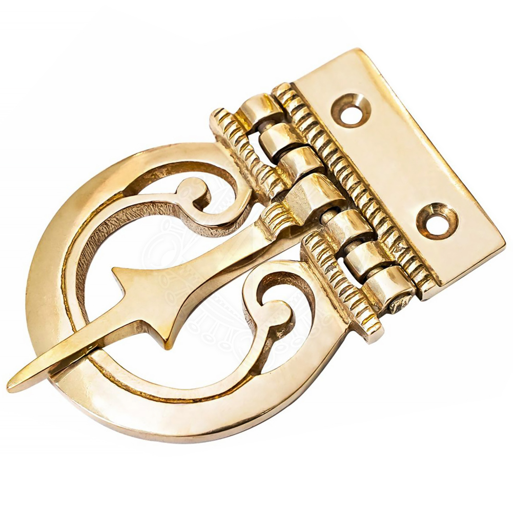 Every detail of this buckle has been designed with historical accuracy in mind. It consists of a sturdy hinged plate for attachment to a belt and a characteristic D-shaped loop with scrolled terminals. The elegant, arrow-shaped tongue securely holds the belt in place. The massive hinge, decorated with a fine ribbed pattern, is a testament to quality craftsmanship, ensuring smooth movement and a long lifespan for the buckle.