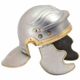 This reconstruction of the Witcham Gravel auxiliary cavalry helmet with hinged cheek guards is crafted from 1.2mm (18 gauge) steel and richly adorned with brass fittings. As the interior is unlined, we recommend the use of an additional padded cap to make it fully wearable. Small rings are fitted on the inner side of the cheek plates for easy attachment of a chin strap (not included). The yellow crista, which is based on a reference found in Ars Tactica by ancient Greek historian Arrian, has a wooden base painted in red and is equipped with 3 screws for proper attachment to the helmet's (pre-drilled) bowl. Further product information ...