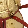 This helmet is a very faithful and skilfully crafted reconstruction of the original Deurne find. Its bowl is constructed using the Spangenhelm method – it is riveted together from six individual segments (spangen). The materials used are a combination of steel and brass, giving the helmet its characteristic, splendid appearance. The helmet features a nasal guard, articulated cheek pieces, and a neck guard which is attached via two leather straps with buckles, allowing it to be secured or even completely removed. The insides of the nasal, cheek pieces, and neck guard are lined with red leather for enhanced comfort. The overall impression is underscored by the rich decoration in the form of embossed patterns and rivets/bosses.