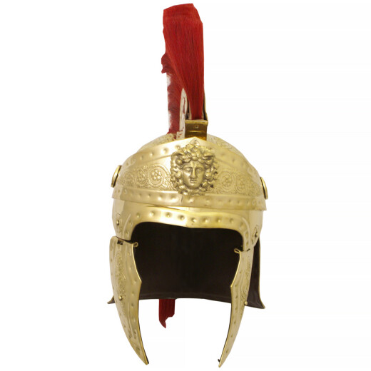 Step into the world of ancient Rome with this beautiful and intricately detailed replica of a ceremonial helmet, as worn by the elite soldiers of the Praetorian Guard. Crafted from gleaming brass sheet, this helmet is a masterpiece that captivates with its rich ornamentation and imposing appearance – just as it did in its heyday. Its dominant feature is the striking red crest made of real horsehair and the detailed relief of a Gorgon's head on the brow plate. This Roman helmet is not only a great addition to your collection but also a fully functional piece for historical reenactments or LARP. Further product information ...