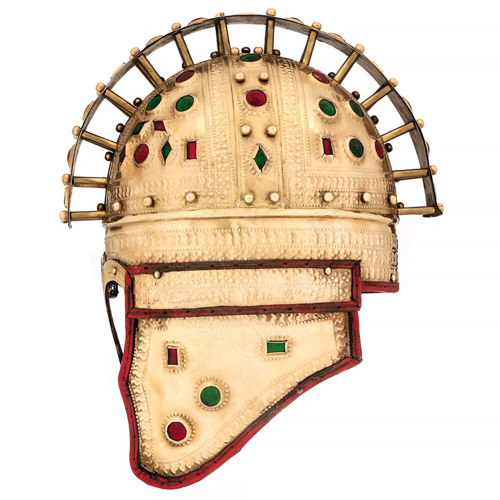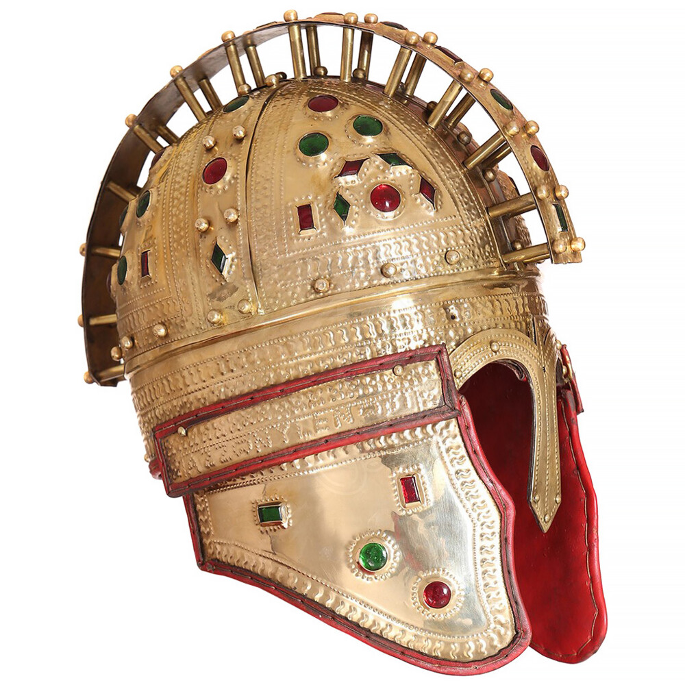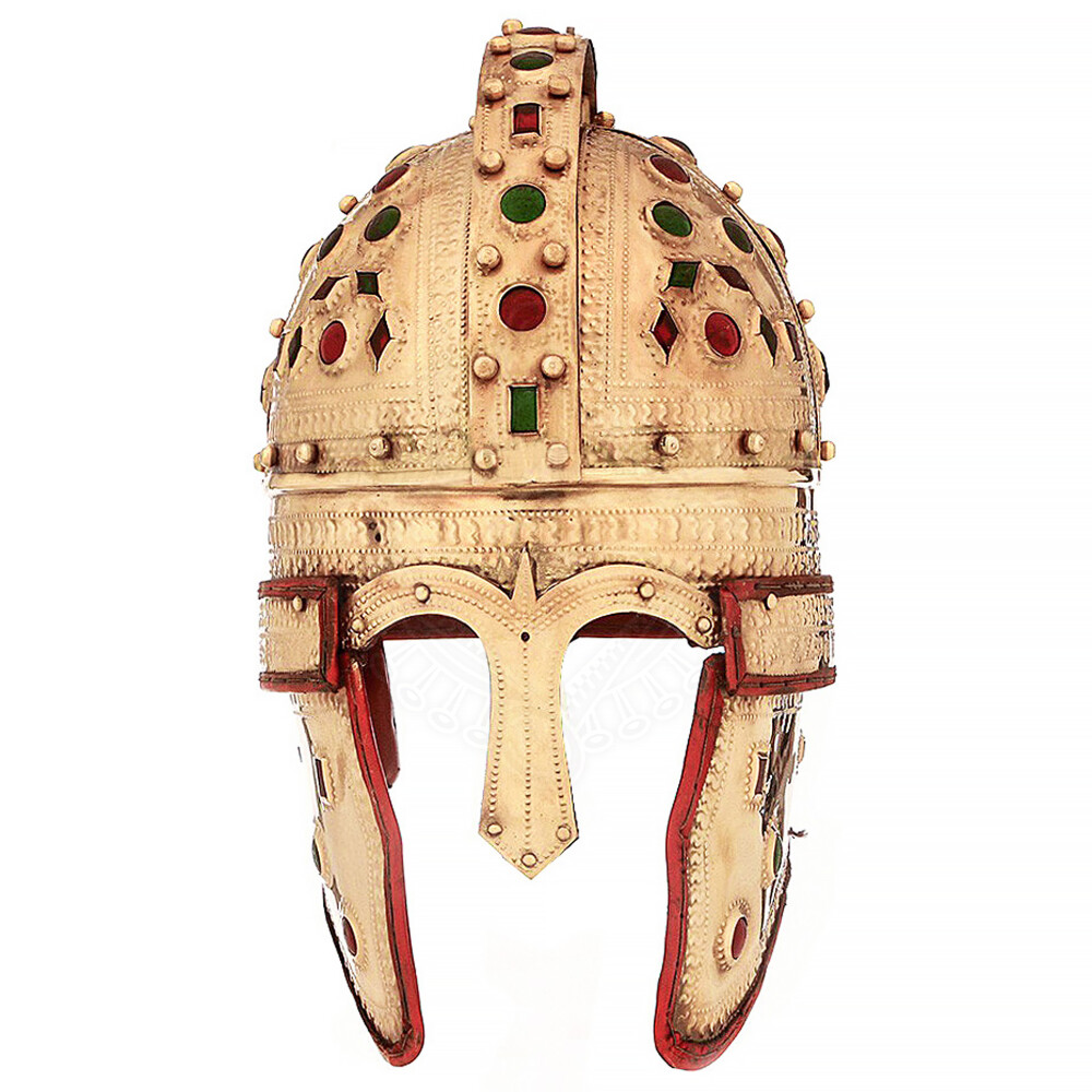 This replica faithfully emulates the shape and ornamentation of Late Roman helmets, particularly the famous Berkasovo find. The golden-coloured brass construction is set with numerous glass stones in various colours (predominantly red, green, and dark shades reminiscent of onyx or sapphire) and shapes (round, rectangular, diamond-shaped), imitating the precious gems of the original artefact. The helmet's surface is further articulated with chased geometric and floral motifs, dotting, and lines, underscoring its luxurious and detailed character. A striking feature is the central crest running from the forehead to the nape, also richly decorated with inset stones. A decorated arch curves over the brow, transitioning into an openwork, diadem-like structure that adds to the helmet's noble appearance. The helmet features hinged cheek pieces and a fixed neck guard; both are padded on the inside and covered with high-quality red leather for your comfort. The interior of the helmet is fitted with a quilted liner, also made of red leather, complete with straps for individual size adjustment and a stable fit on the head.