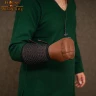 The gauntlet is crafted from high-quality and robust leather, with 7-8 ounce leather used for the protective plates covering the back of the hand and fingers. This ensures very good resistance to normal wear and tear and absorption of impact energy. The base of the gauntlet under the plates is designed to be sufficiently flexible for comfortable wear and does not restrict finger movement. Pronounced padding on the knuckles and thumb provides an additional layer of protection for these particularly sensitive and exposed areas. The cuff, made of even thicker leather, is covered on its outer side with aluminium chainmail. The main advantage of aluminium is its low weight, so the cuff does not unnecessarily burden the hand and forearm, and at the same time, its natural resistance to corrosion, which simplifies maintenance. An elegant suede trim on the edges of the cuff adds to the overall comfort and completes the aesthetic appeal.