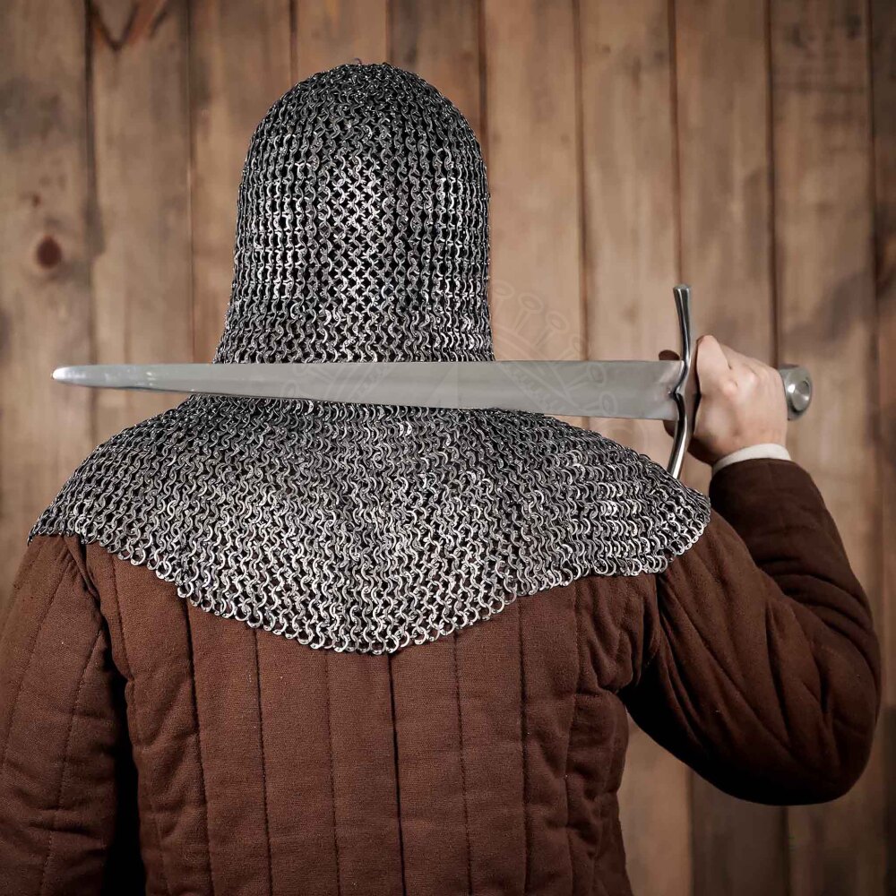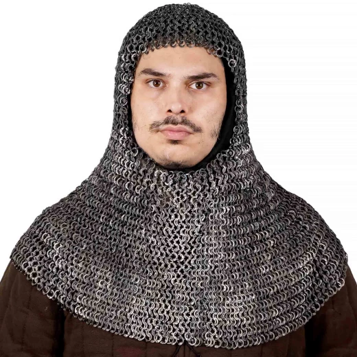 Experience a revolution in protection with this ultra-lightweight chainmail coif crafted from titanium! Combining flat, riveted titanium rings with an internal diameter of 9 mm and a thickness of 1.4 mm (17 gauge), you get incredibly lightweight yet strong protection. Weighing only approximately 1279 grams (approx. 2.82 lbs), this coif is the ideal choice for theatrical performances, film shoots, LARP, or for anyone seeking maximum comfort without compromising on an authentic look. Further product information ...