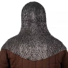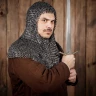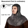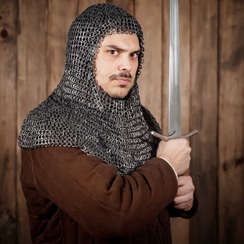 As you can see in the photograph, this coif retains the classic shape with a mantle protecting the neck and shoulders, but its secret lies in the material and ring construction. It features flat titanium rings, each individually fastened with a dome-head rivet. This solution not only contributes to its historical appearance but also ensures robust connections. Titanium has a natural, slightly matte metallic look that adds to the coif's authenticity. Thanks to its extremely low weight, you'll almost forget you're wearing it!