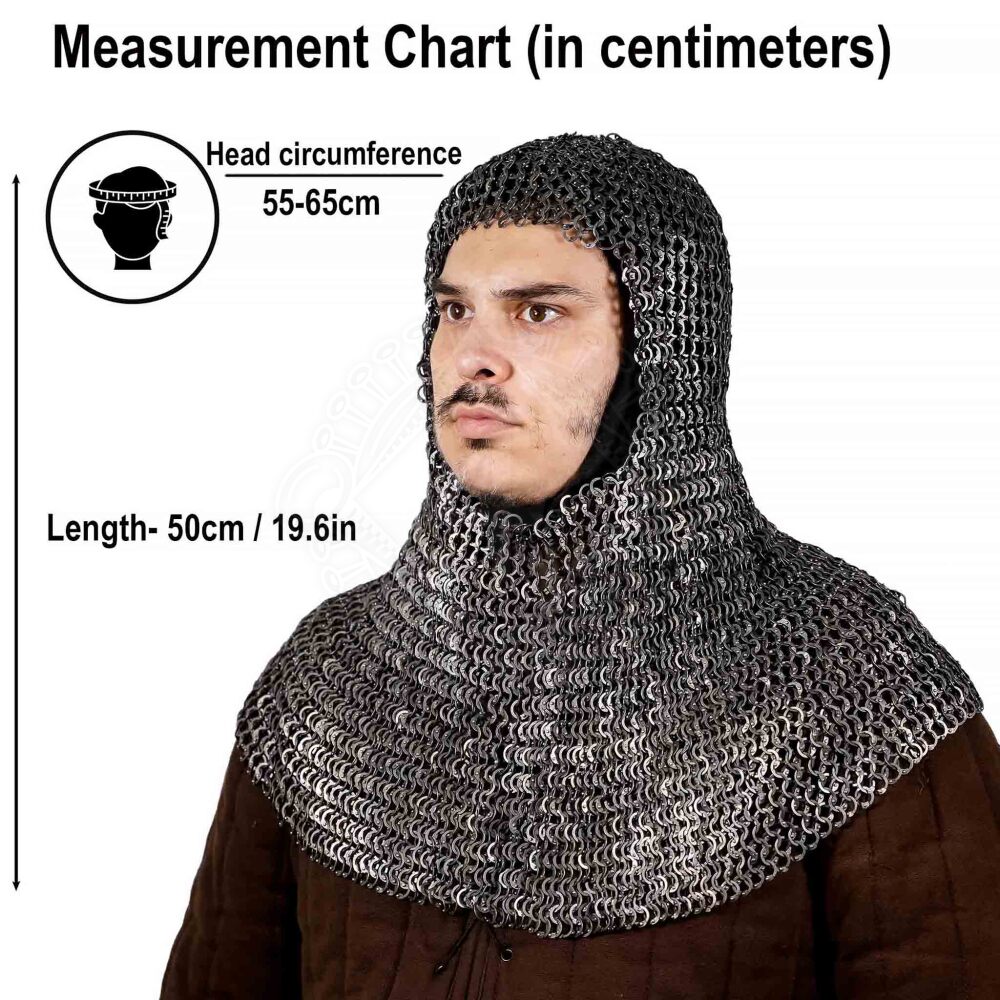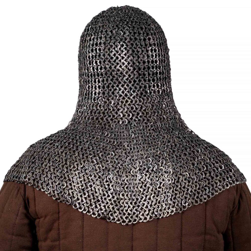 Although titanium is a modern material for armour construction, the style of the rings themselves—flat and riveted—has deep historical roots. Flat rings, often made by stamping or forging, allowed for a denser weave and provided better protection against certain types of attacks compared to round wire rings of the same thickness. Riveting was the standard for quality chainmail, ensuring the strength of each link. This coif, therefore, combines a historically faithful design with the advantages of modern material.