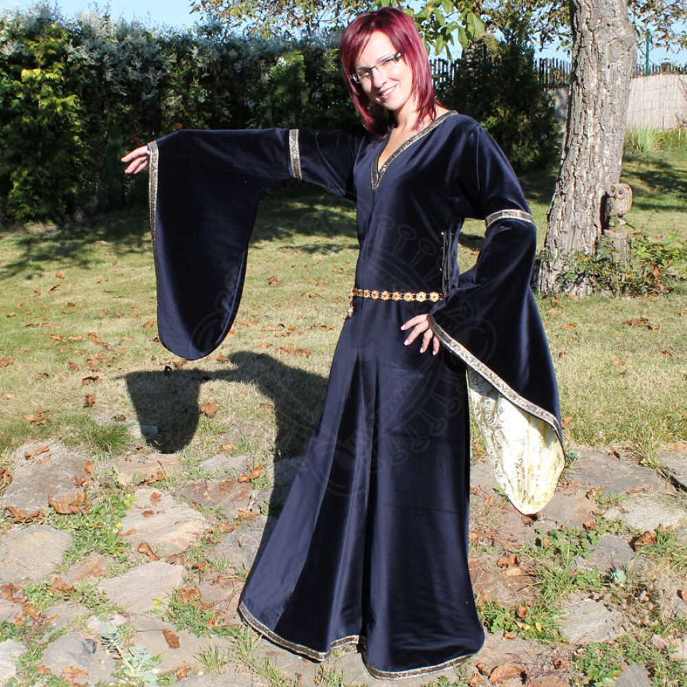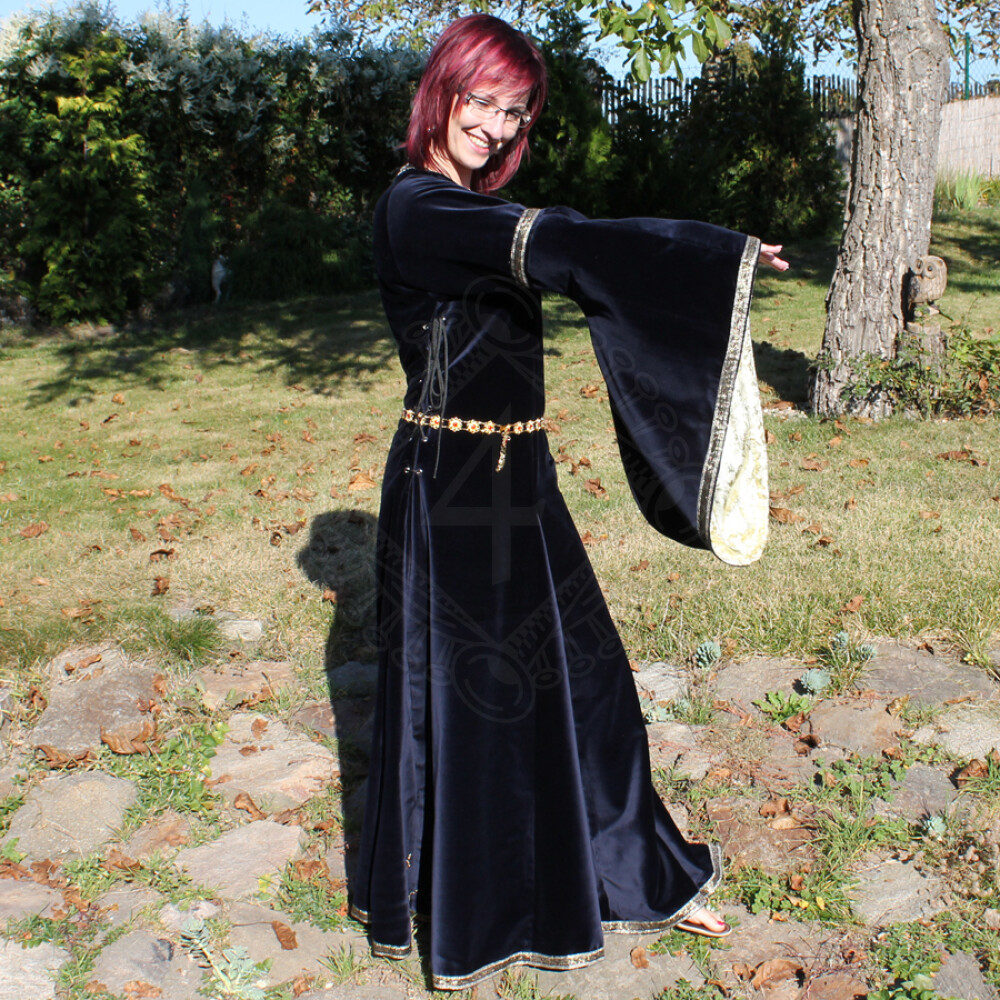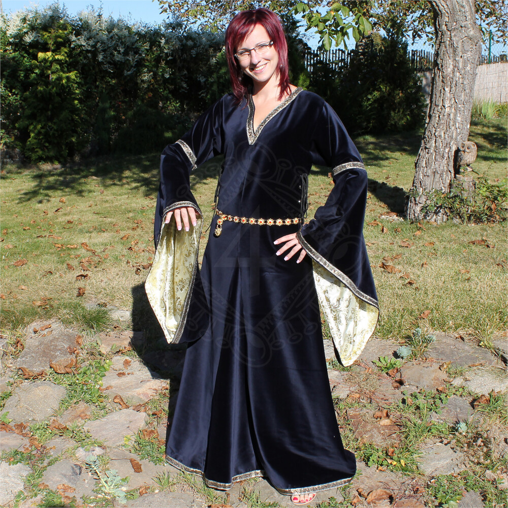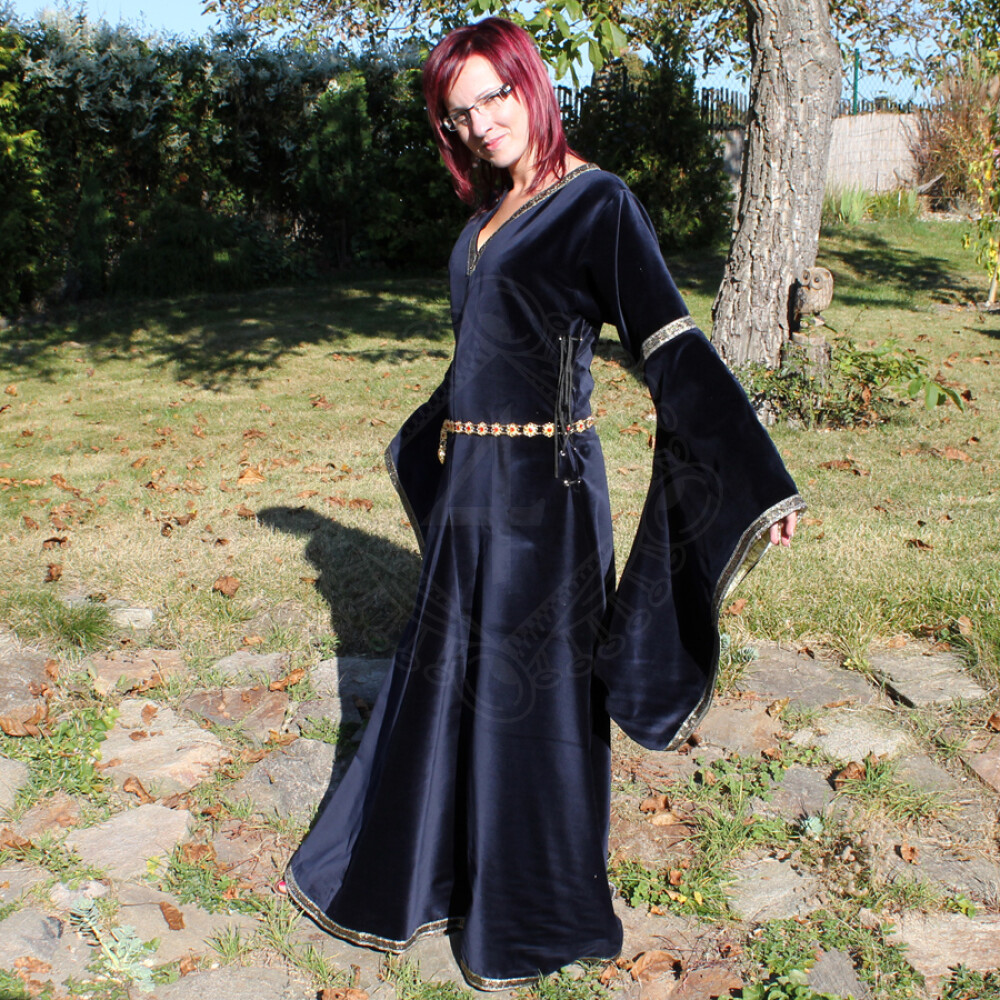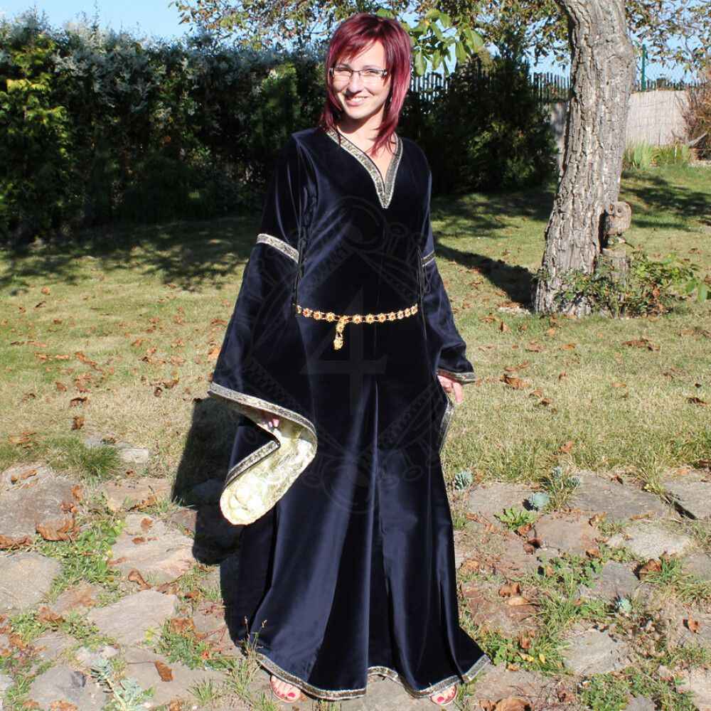 The bliaut for women is made of velvet. Its sleeves and the neckline are decorated with golden embroidery. The sleeves are lined with brocade. Instead of brocade, they can be lined with fake fur on request. It can be adjusted to the exact size of your body thanks to lacings on both sides. The bliaut comes with a metal belt of golden colour decorated with red acrylic stones. Further product information ...