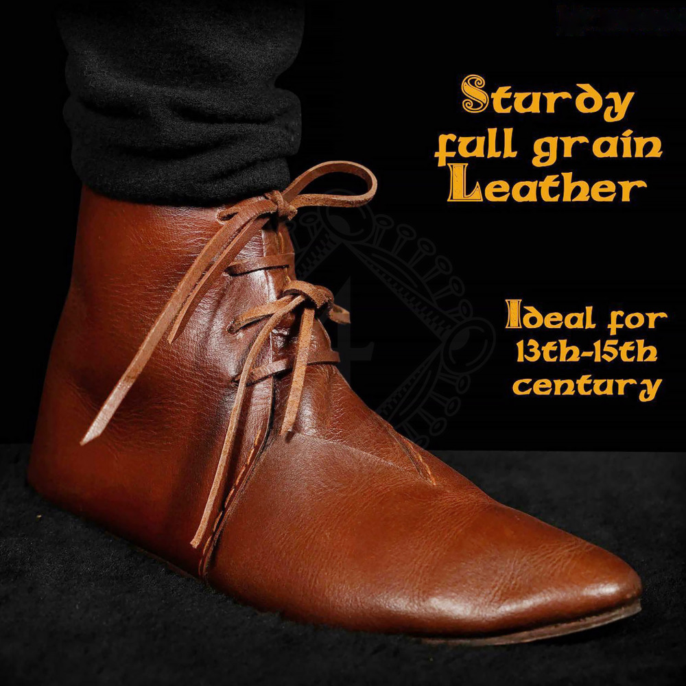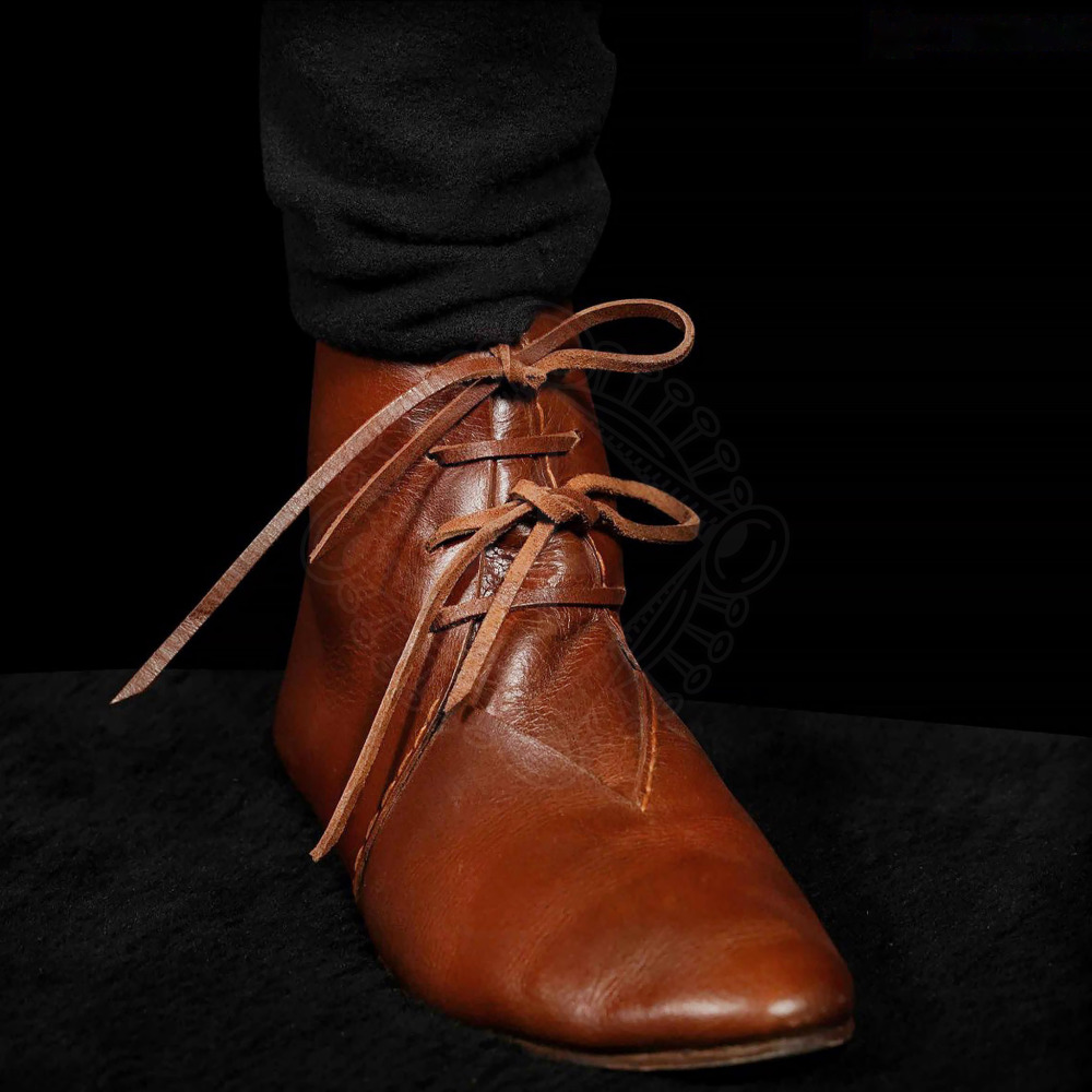 The cut of these boots is loosely inspired by archaeological footwear finds from London, dated to the period between the 12th and 15th centuries. This type of ankle boot with side lacing was very popular and widespread throughout Europe during the High and Late Middle Ages. They were practical and durable shoes worn by various social classes, from townsfolk to soldiers. The simple leather sole (with no modern heel) corresponds to historical patterns and provides an authentic walking feel at historical events.