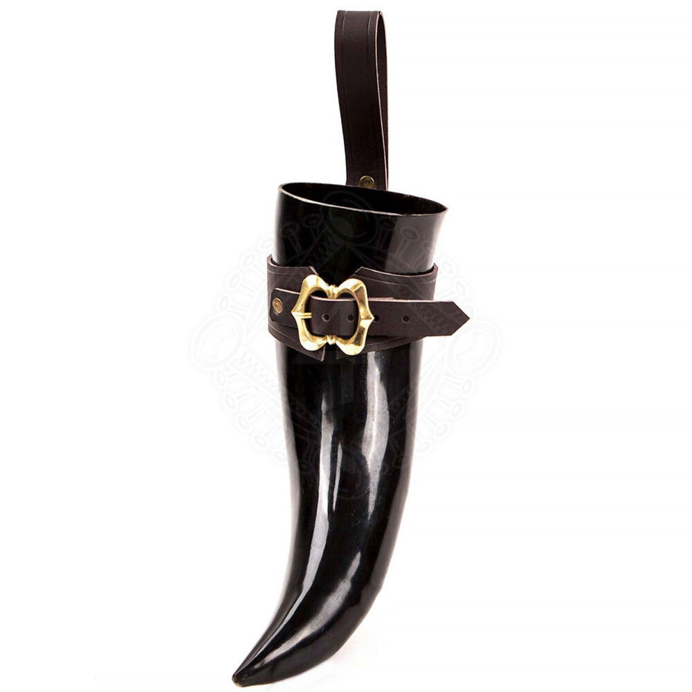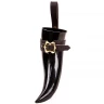 Forget about constantly putting your horn down. A robust leather belt holder (or holster) is included in the package. It's made from high-quality cowhide leather and features an adjustable strap with a beautiful, historically shaped brass buckle. This ensures the horn sits securely in the holder while still being easy to remove. The belt loop is wide enough for most standard belts.