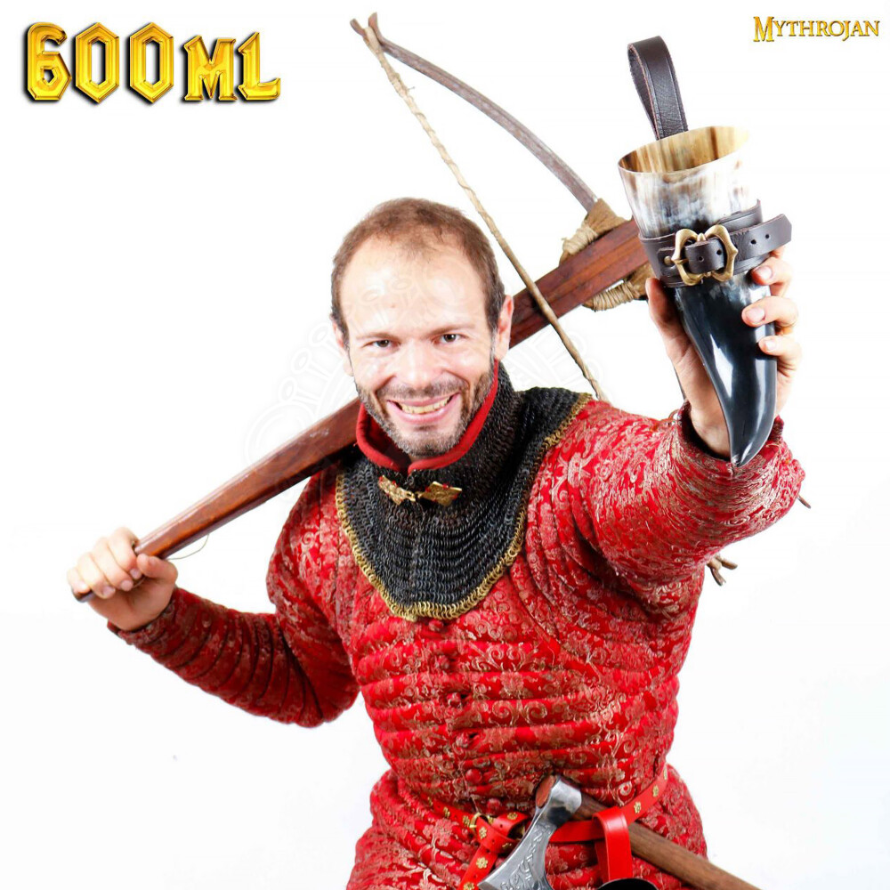 Make a toast like a true Viking warrior at your next feast, festival, or LARP battle! This magnificent and substantial drinking horn is crafted from a genuine ox horn and represents the perfect combination of authentic appearance and premium craftsmanship. With a respectable capacity of approximately 400 ml, it will quench even the mightiest thirst for mead or beer. Its rim is reinforced with an elegant brass trim, which not only adds a touch of luxury but also enhances its durability. The horn comes with a practical and stylish genuine leather holder, which you can easily hang from your belt. Thanks to the ornate brass buckle, your Viking horn will always be securely at hand while perfectly complementing your historical costume. Further product information ...
