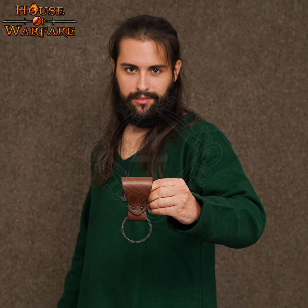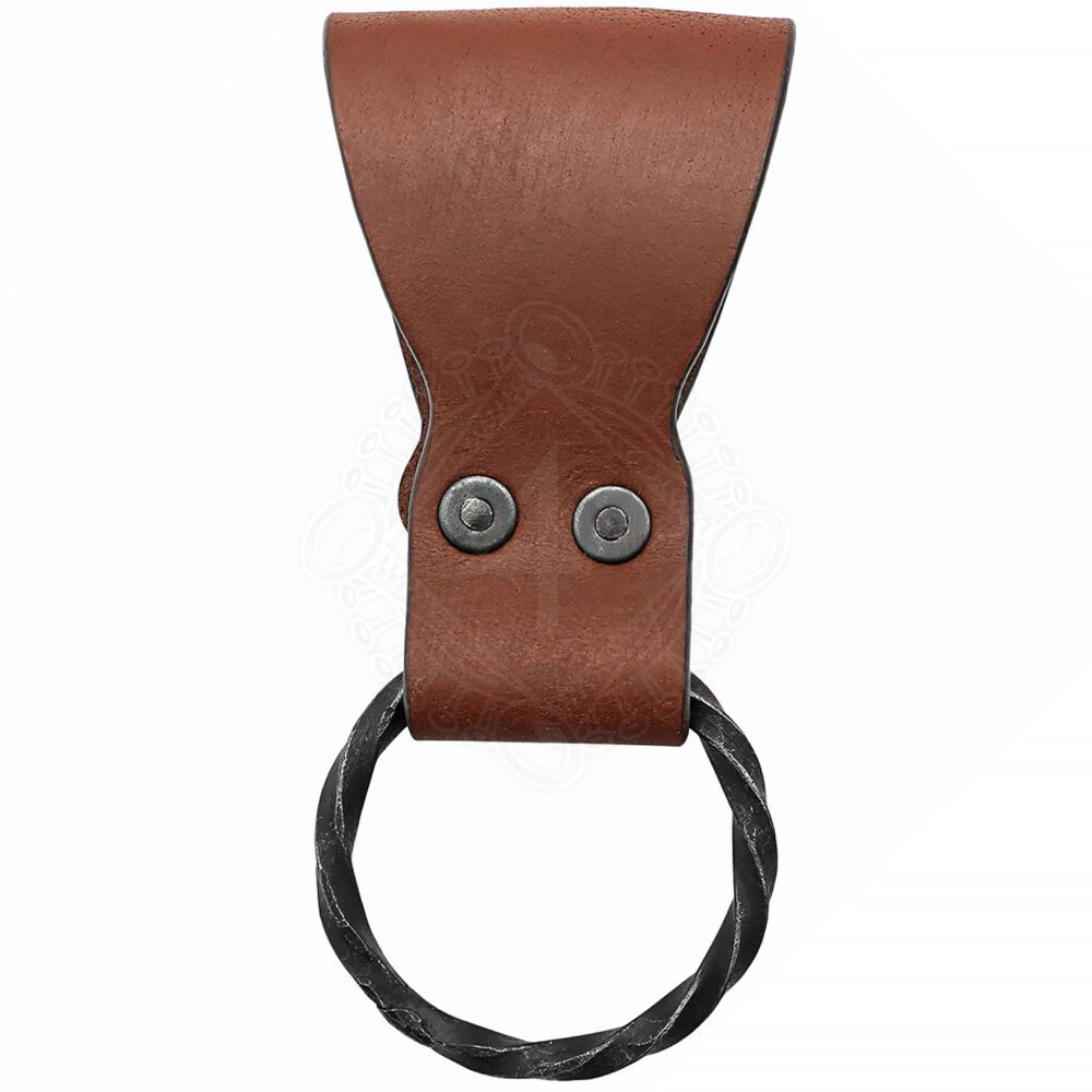 Keep your axe, mace, or war hammer always at hand, yet keep your hands free for battle or work. This leather belt frog from **House of Warfare** is a robust and stylish accessory for any warrior, craftsman, or adventurer. It is made from quality cowhide leather and its dominant feature is a hand-forged iron ring with a distinctive twisted texture that speaks to honest craftsmanship. The strong riveting ensures that the frog can easily carry even heavier weapons and tools. Thanks to the universal loop, you can easily slide it onto most belts. It is an indispensable piece of equipment for reenactment, LARP, or any historical festival. Further product information ...