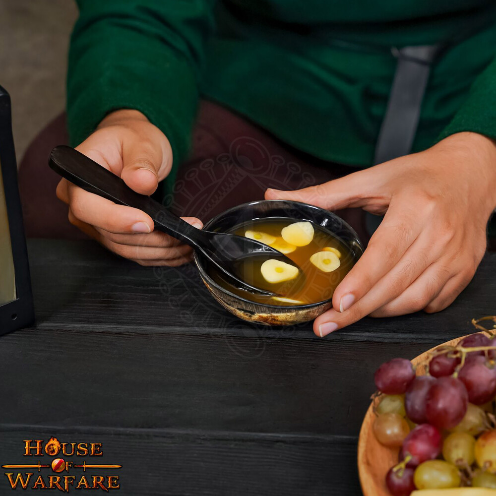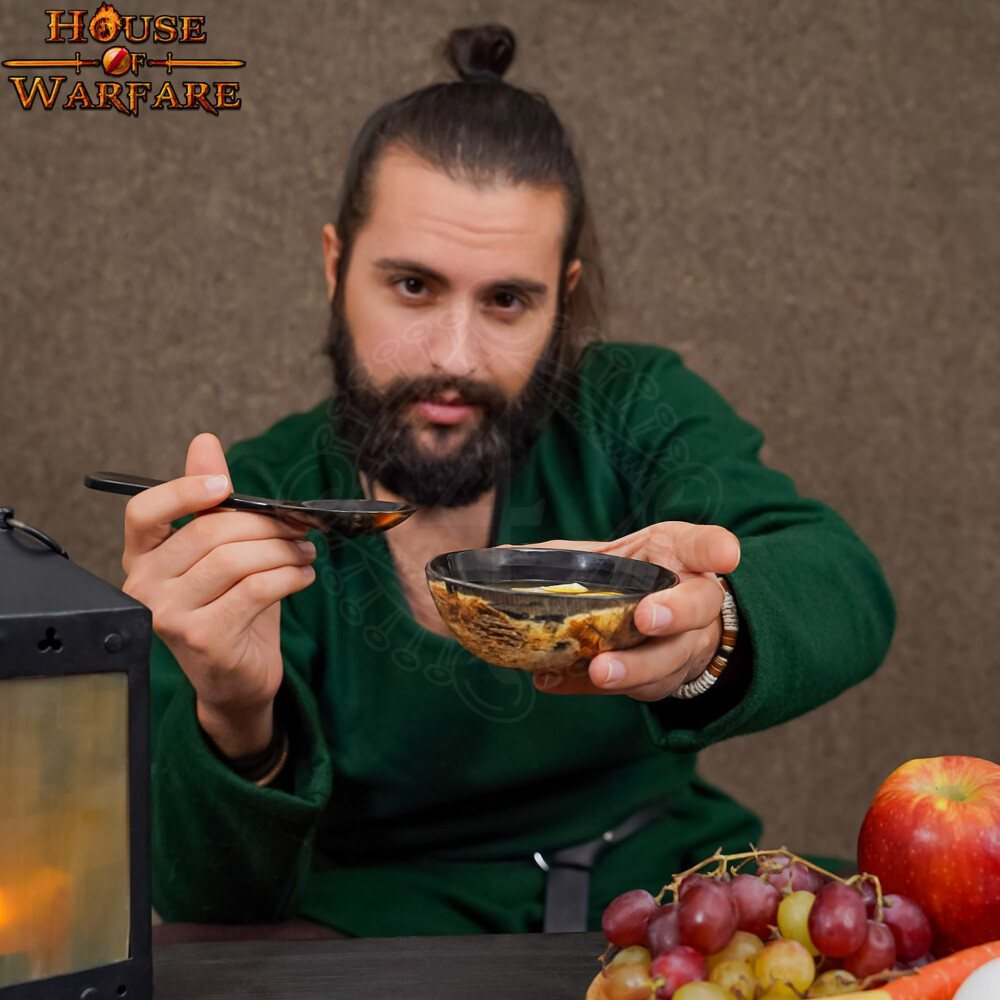 Enjoy your soup, porridge, or favourite dessert like a true Viking or medieval noble with this original bowl made from genuine horn. Each piece is a complete one-of-a-kind, boasting a unique combination of a rough, rustic exterior and a smoothly polished interior. With a diameter of 10.5 cm, this bowl is the ideal size for a single portion, whether it's a side dish, a thick stew, or simply nuts and dried fruits at a feast. It's not only a fully functional vessel but also a beautiful accessory that will lend an unparalleled atmosphere and authentic character to your historical dining table, LARP banquet, or fantasy camp. Further product information ...
