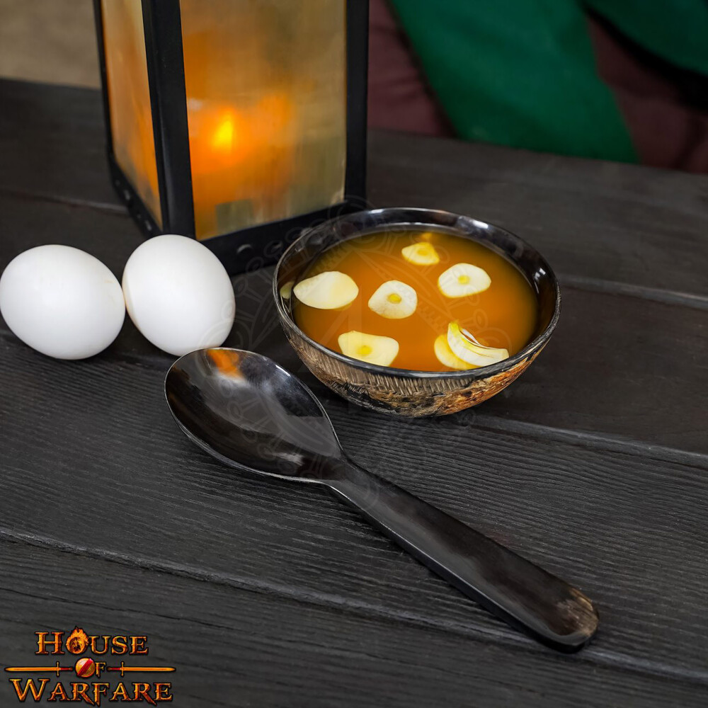 This horn bowl is the perfect choice for anyone with an eye for detail. Its natural grain and colouration, ranging from dark tones to honey-gold hues, ensure that you will never find two identical pieces. Thanks to its sturdiness and light weight, it's more practical and durable than ceramic tableware, which you'll especially appreciate in the field conditions of a historical camp. It is perfectly suited for portraying Celts, Vikings, characters from the early and high Middle Ages, as well as for fantasy worlds.