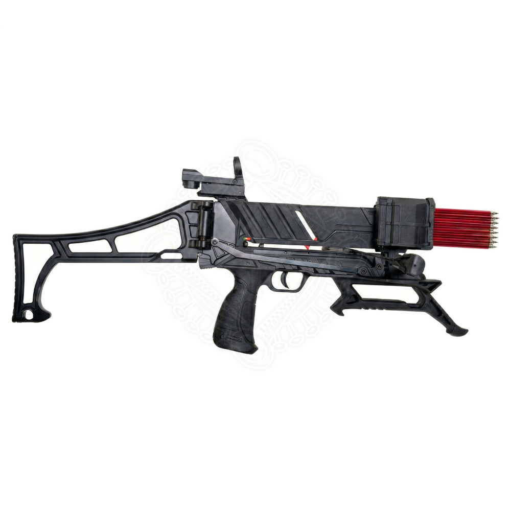 The VLAD model builds directly on the massive success of the legendary RX Adder and Steambow Stinger crossbows, inheriting their best technological features. The core element is the folding stock: by snapping it downwards, it acts as a massive lever to effortlessly draw the string. Even with the heavy 90 lbs limb installed, you can cock the crossbow without straining. You can load the magazine in an instant using the included quick loader. A high-quality aluminium Red Dot sight is also included, allowing you to acquire your target quickly and accurately. The crossbow is lightweight, perfectly balanced, and its tactical appearance commands respect.