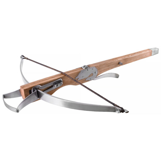 This elaborate reconstruction of a 14th c. crossbow has a steel prod fitted onto a wooden stock. The cocking stirrup, trigger, nut and all additional fittings are also crafted from steel. Further product information ...
