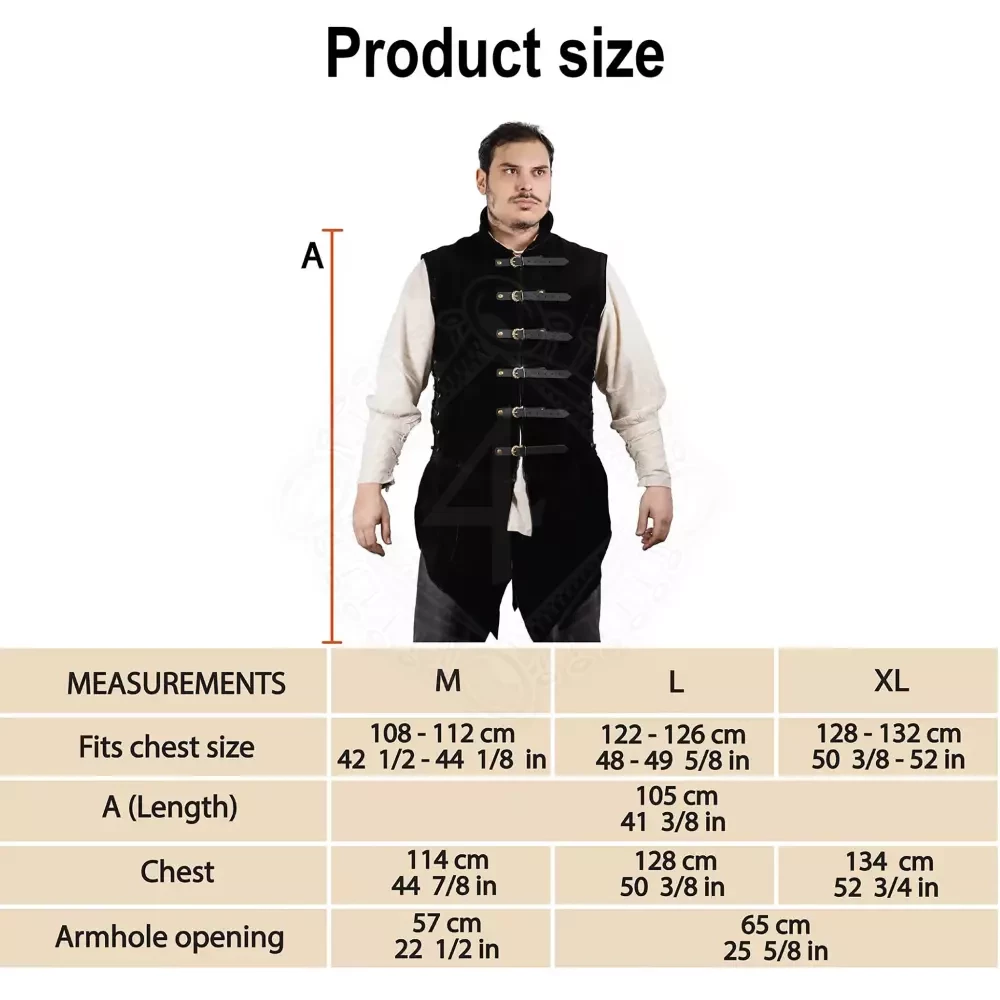 | Size | Fits Chest Size | Length (A) | Actual Jerkin Chest | Armhole Opening |