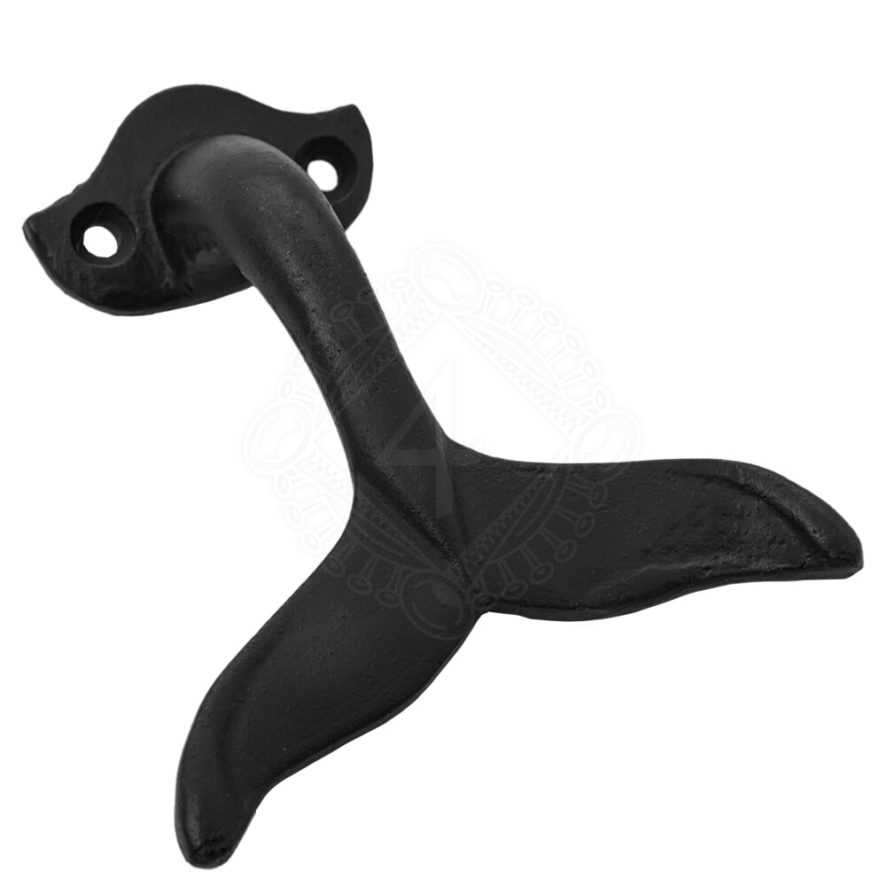 Each hook is artfully shaped in the form of a whale's tail fluke. The fluke elegantly curves upwards, with its tips forming a practical double hook for convenient hanging. They are crafted from solid cast iron with a characteristically rough, rustic surface. The traditional oil-blackened finish gives the hooks an antique patina while also providing protection. The mounting plate at the base is equipped with two holes for secure wall fastening.