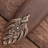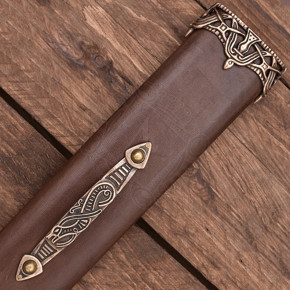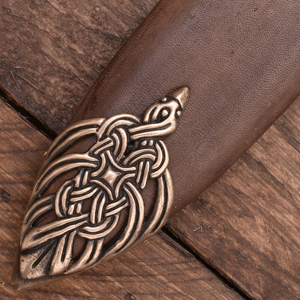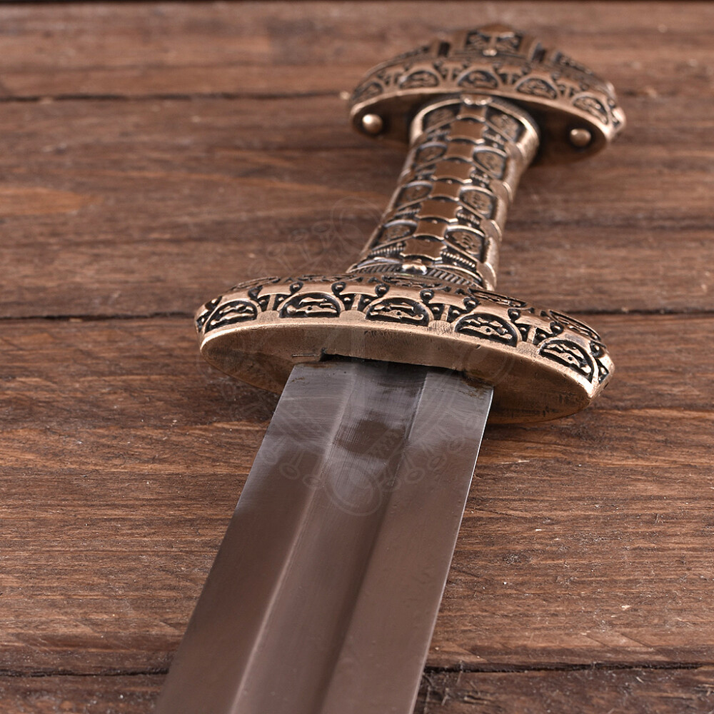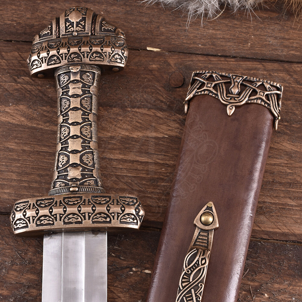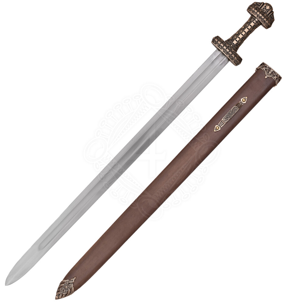 This Viking sword is a replica of a sword from the year 800-900 which was found in a museum at the isle of Eigg. It features a blunt, slim high carbon steel blade with a wide fuller. The short guard, grip and pommel are made of cast bronze and richly decorated. The scabbard is made of leather-wrapped wood and features a bronze chape and mouth as well as a belt loop made of bronze (max. belt width 5cm). Further product information ...