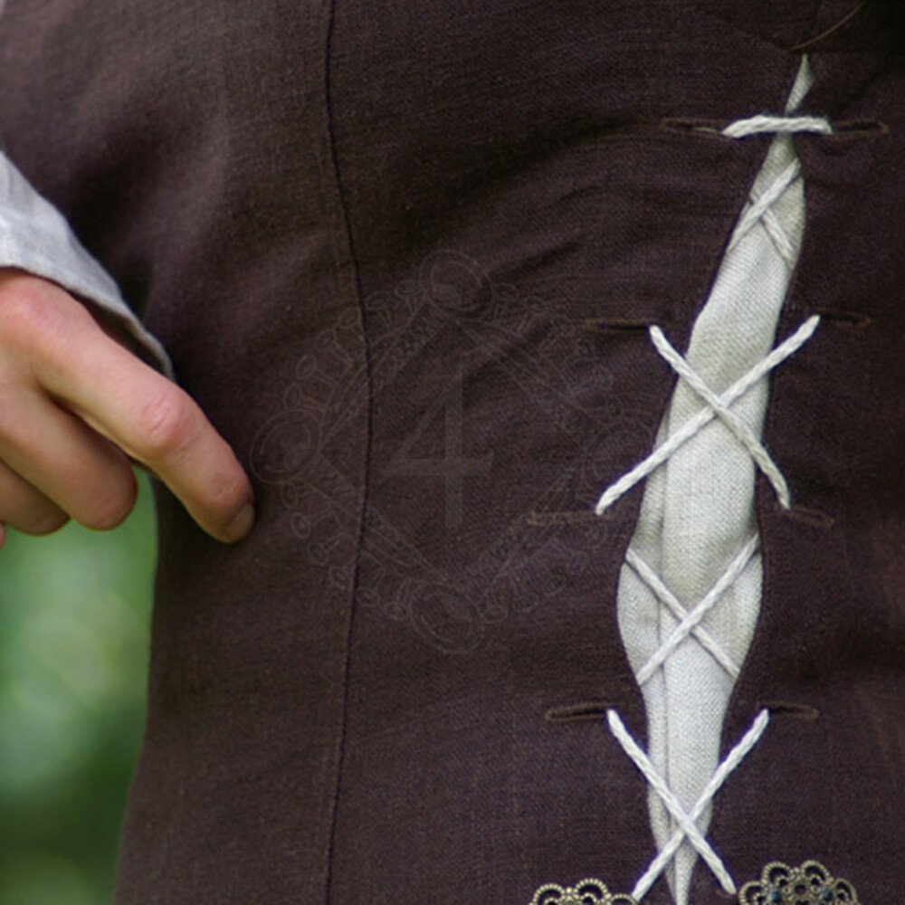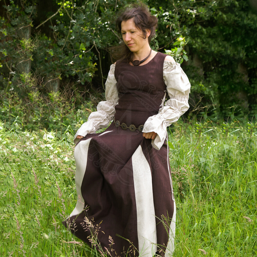 Beautiful medieval dress, blue or brown with natural-coloured inserts. This eye-catching dress can be laced on both sides to underline the female forms with a dynamically flowing skirt.  On both, front- and backside, you’ll find two natural-coloured contrasts. This dress suits perfectly well for all women who prefer sturdier fabrics but nevertheless like to have their skin covered smooth and cushy. We recommend wearing this dress together with the natural-coloured Bodice Blouse. Further product information ...