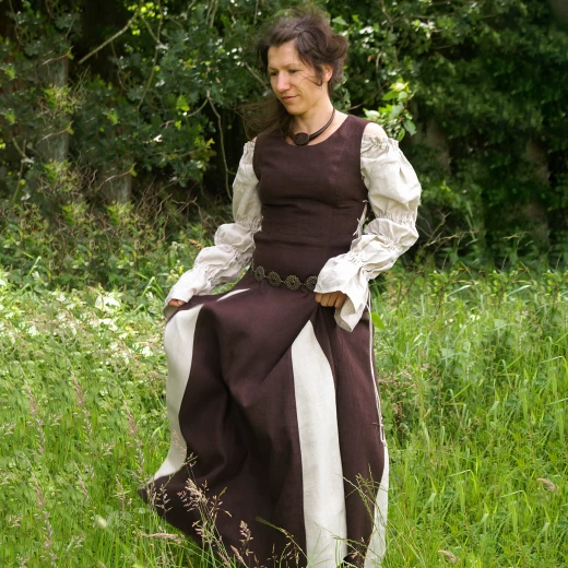 Beautiful medieval dress, blue or brown with natural-coloured inserts. This eye-catching dress can be laced on both sides to underline the female forms with a dynamically flowing skirt. On both, front- and backside, you’ll find two natural-coloured contrasts. This dress suits perfectly well for all women who prefer sturdier fabrics but nevertheless like to have their skin covered smooth and cushy. We recommend wearing this dress together with the natural-coloured Bodice Blouse. Further product information ...