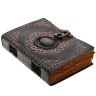 The centre of the mandala is set with a natural stone (typically agate, aventurine, or a similar semi-precious stone), firmly worked into a leather setting with decorative braiding. The entire design is complemented by Baroque or Renaissance-style corner ornaments, giving the book the appearance of an ancient folio.
