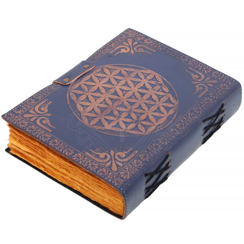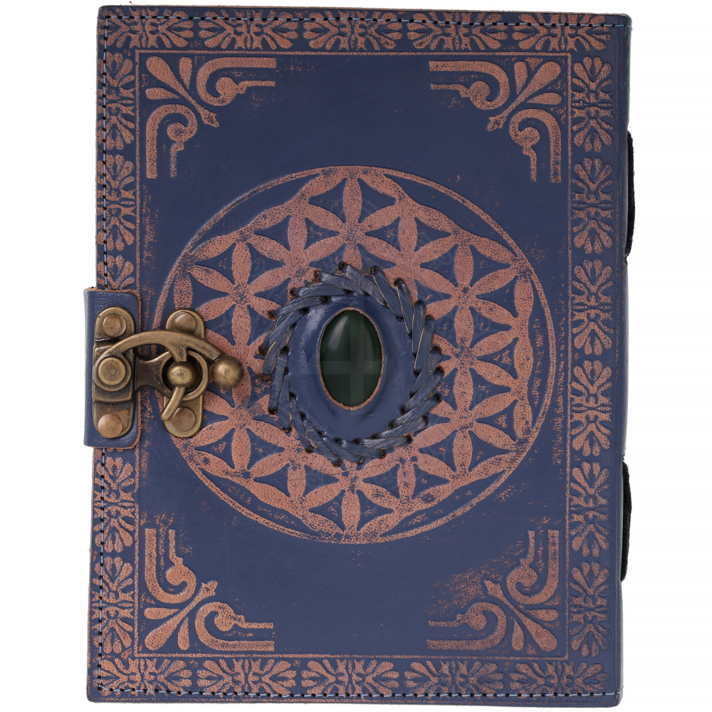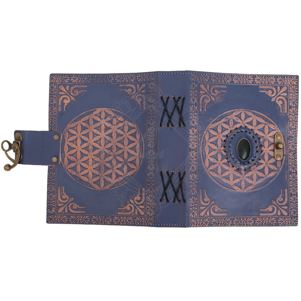Blue Leather Grimoire "Flower of Life" with Gemstone
