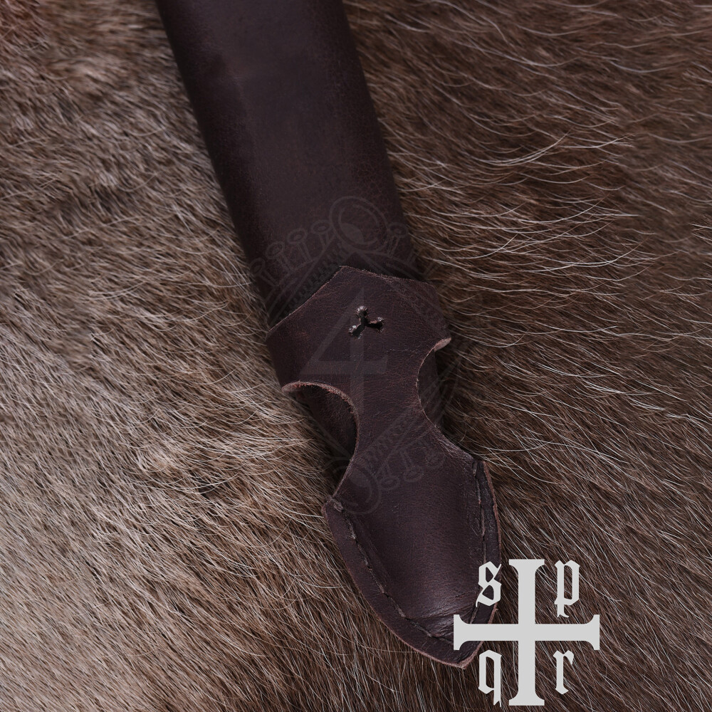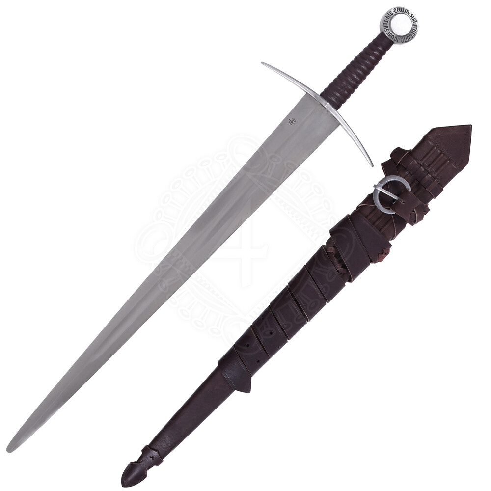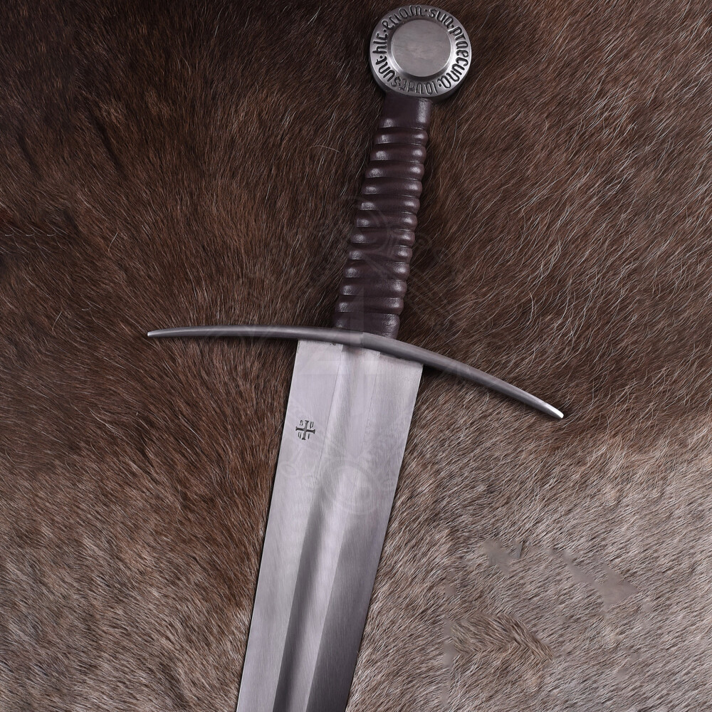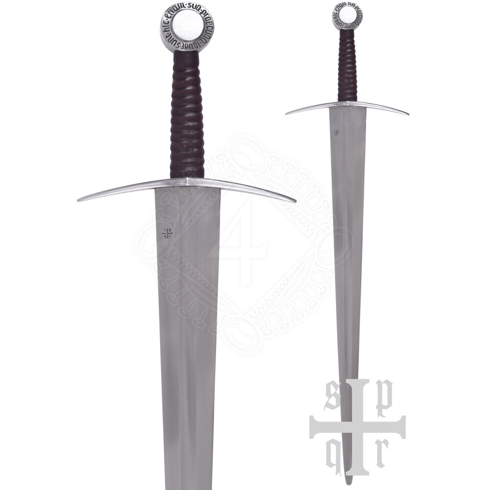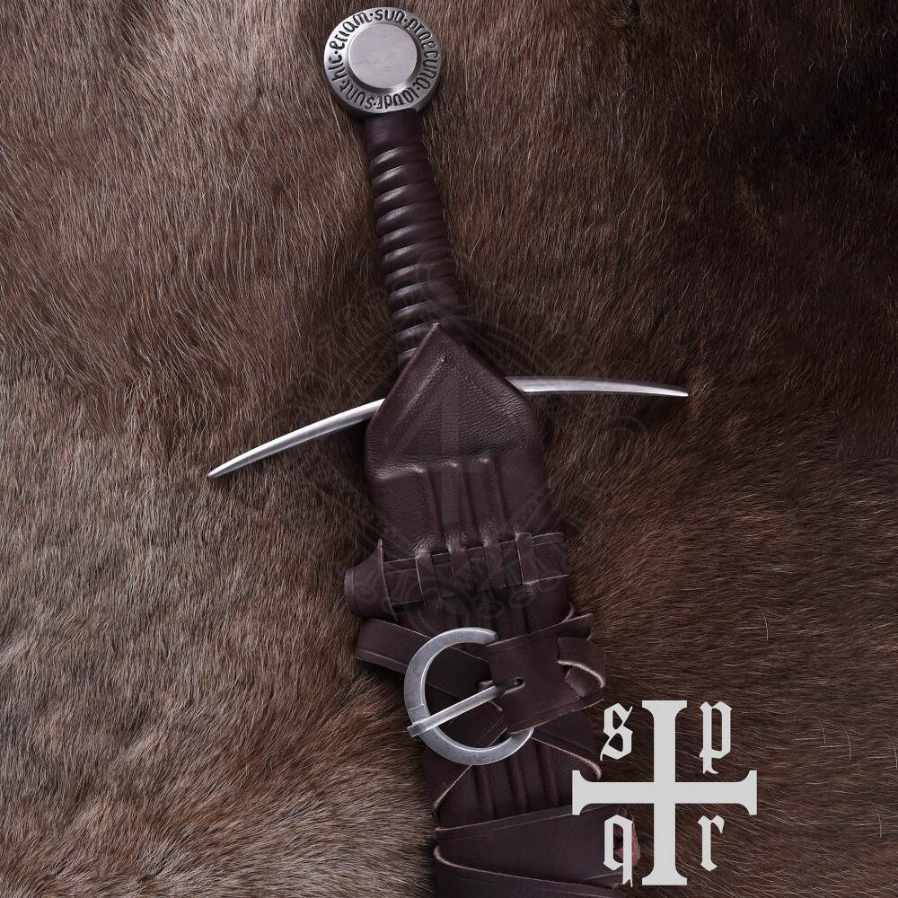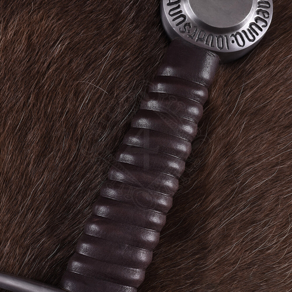 This replica features a full tang blade forged out of spring steel, hardened and tempered to a Rockwell hardness of approx. 48-50 HRC. The steel cross guard has bent ends and the leather-wrapped wooden grip is capped with a sturdy disc-shaped steel pommel (or wheel pommel) bearing the Latin inscription Sunt hic etiam sua praecuna laudi, a quotation from Vergil's Aeneid (book 1, line 461) which translates to Here too, virtue has its due reward. The gorgeous scabbard with wooden core is covered in leather and comes complete with a carrying belt wound around it.