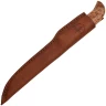 This handmade filleting knife achieves excellent results when filleting fish, for example. The knife blade made of 440A steel arrives sharp at you and is ready for use immediately. An element of reindeer horn embellishes the handle made of Masurian birch. A brass ferrule rounds out the look of this knife. Who wants to use the knife not only indoors in the kitchen, has the possibility to take it everywhere well protected by the included sheath. Through a belt loop, you can also wear the filleting knife on your belt or backpack, if you want to take it out into nature.